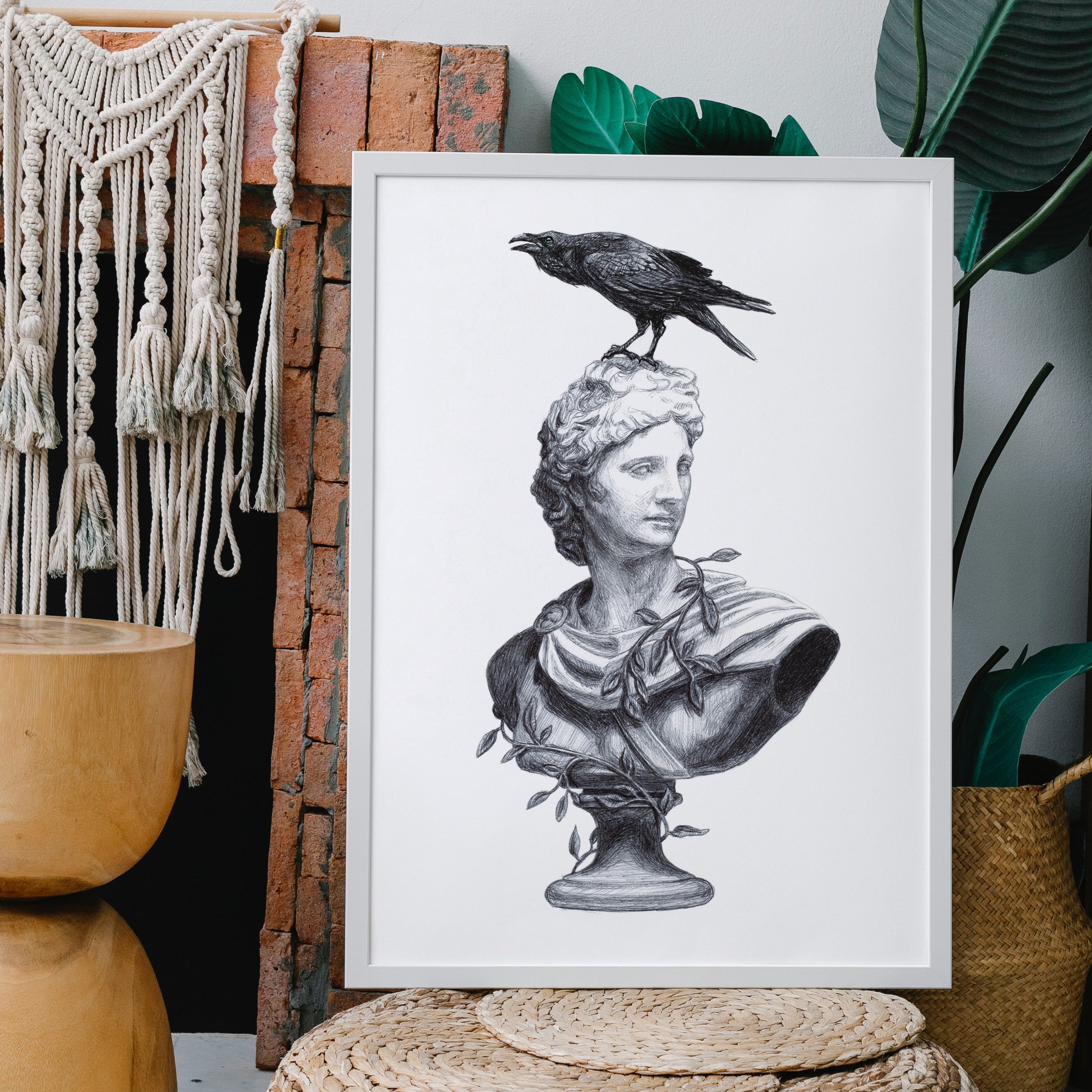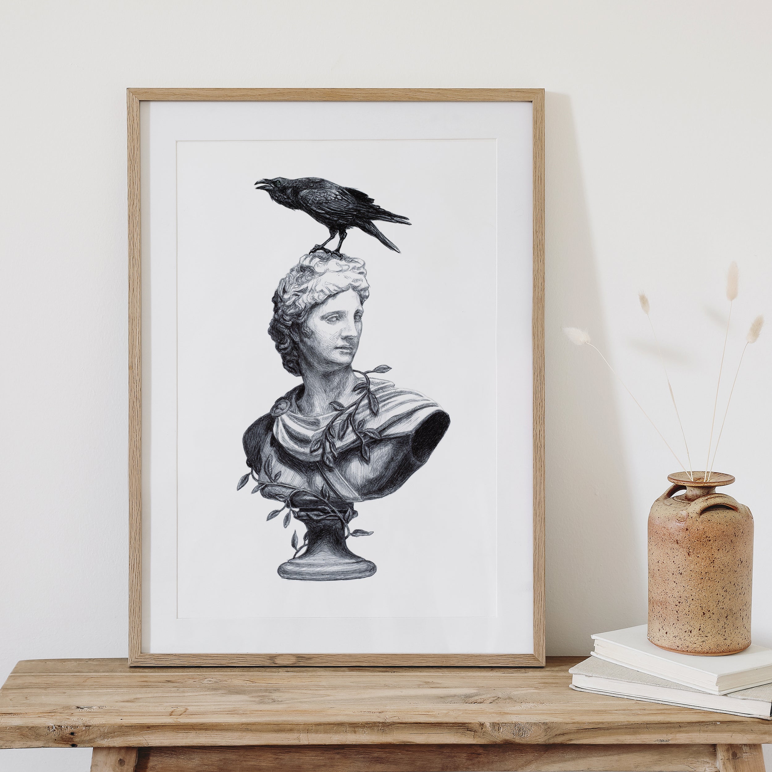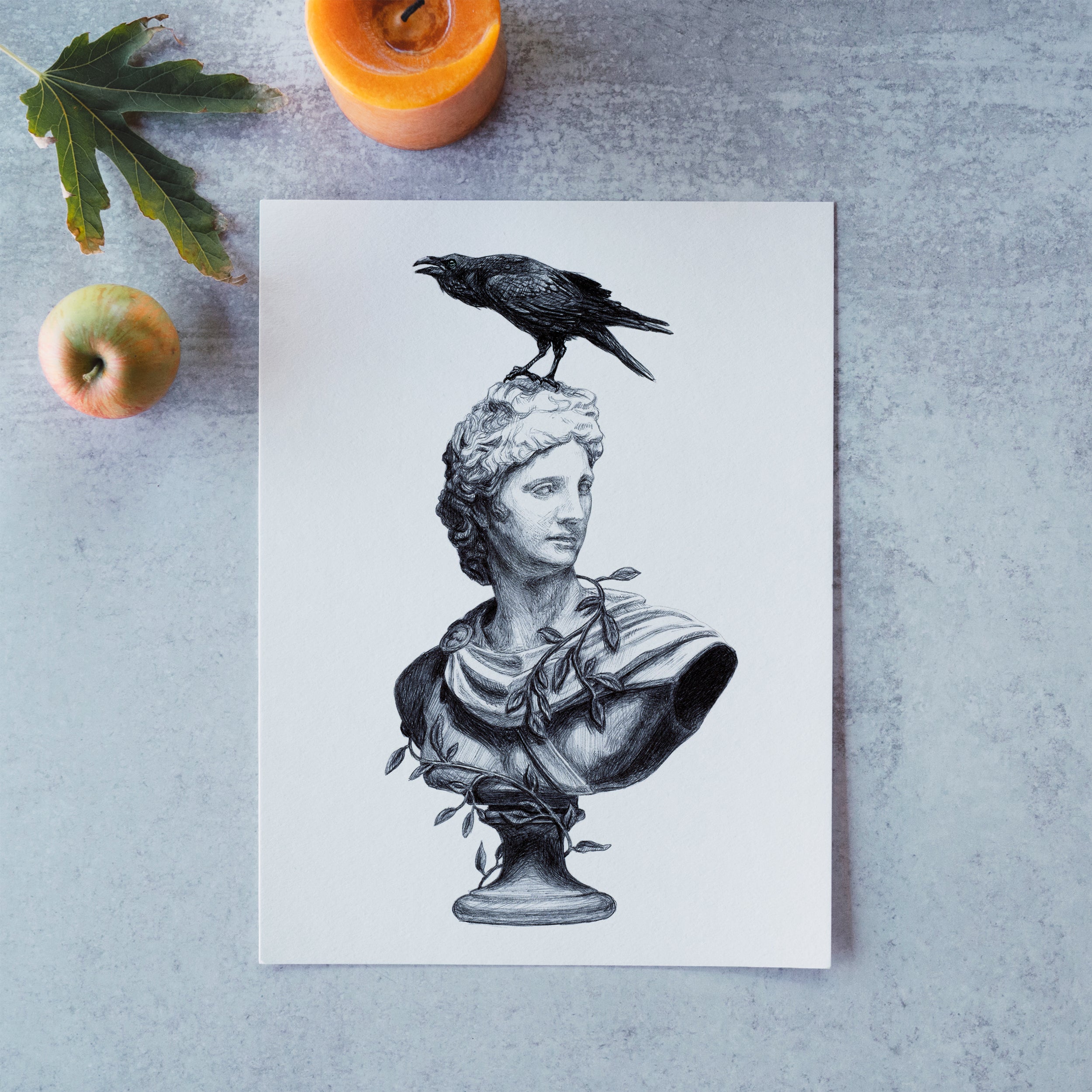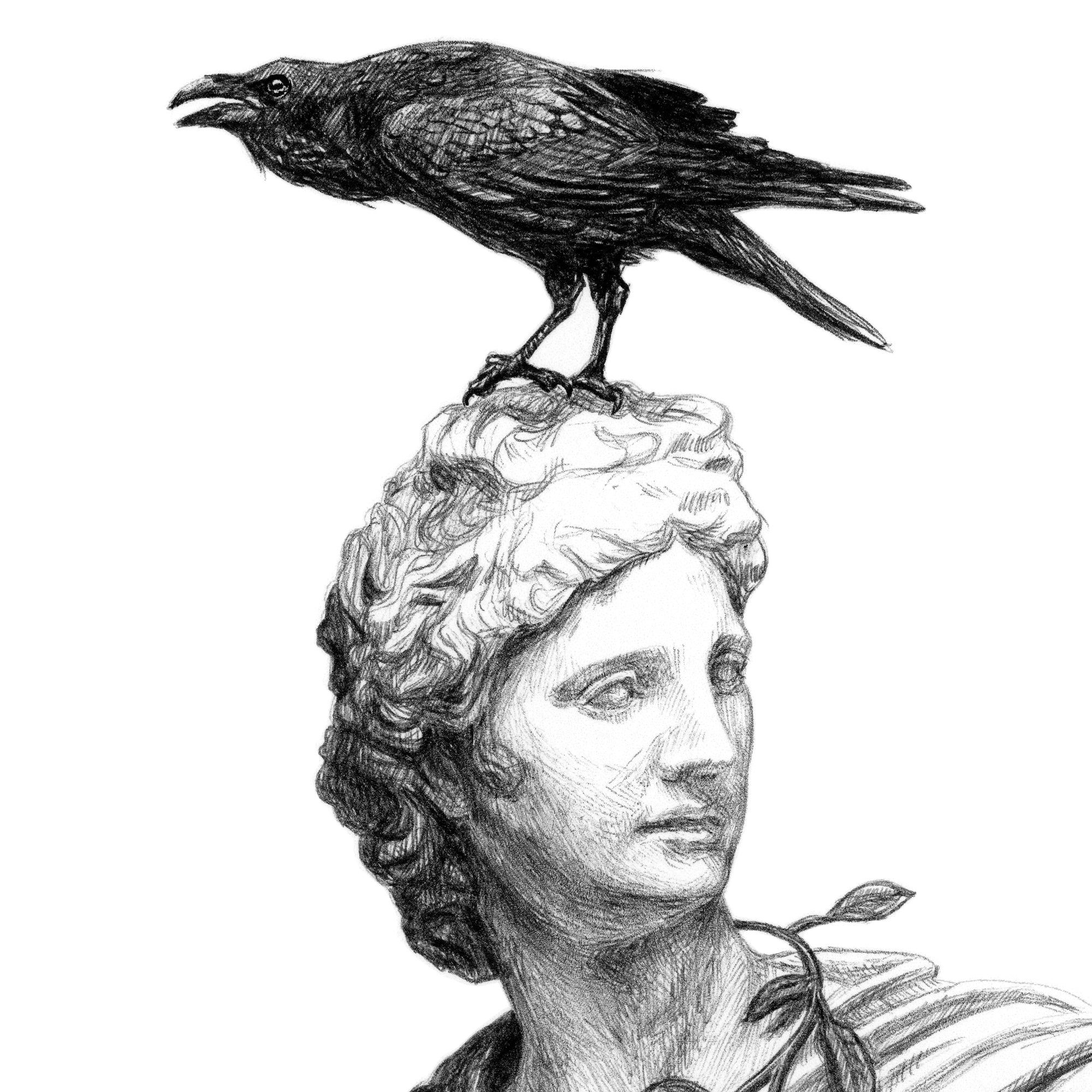 The inspiration for this piece came from the story of Apollo and the Raven from ancient Greek mythology. According to legend, Apollo sent out his white raven to spy on his lover, and when the bird came back with bad news about her fidelity, Apollo was so furious, he scorched the bird until its feathers turned black - which is why, as the legend goes, the ravens of today are black. (Ever heard of “don’t kill the messenger” Apollo?)