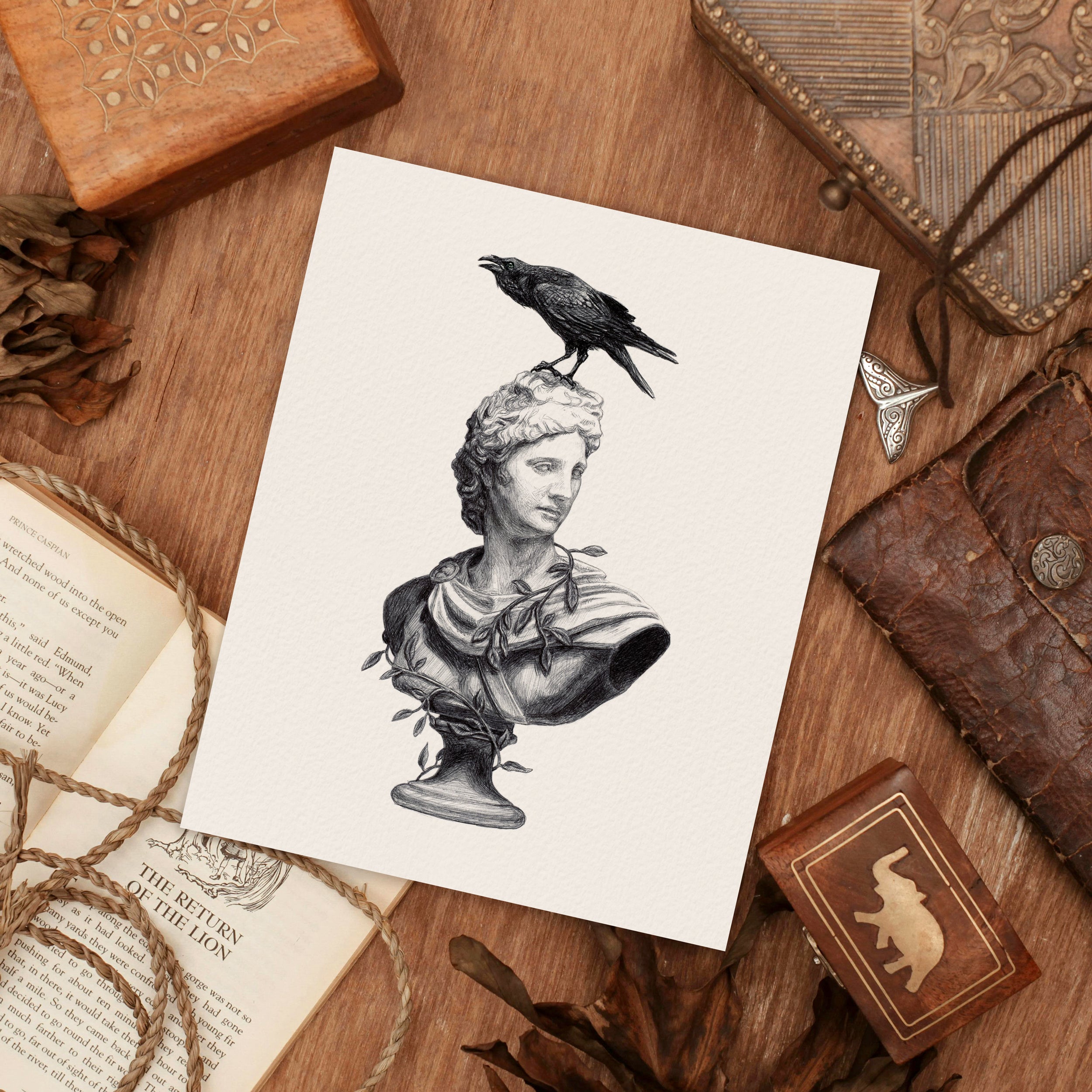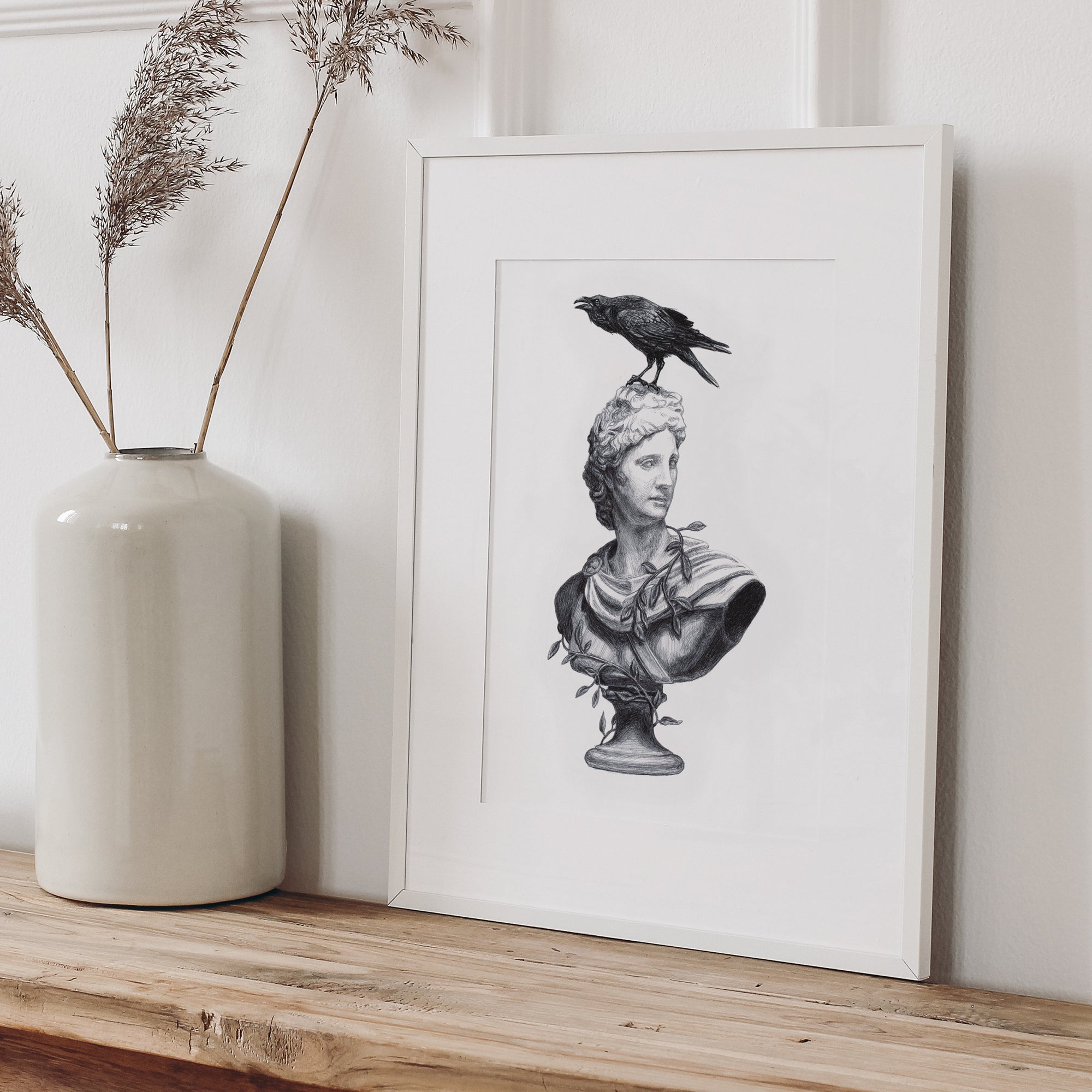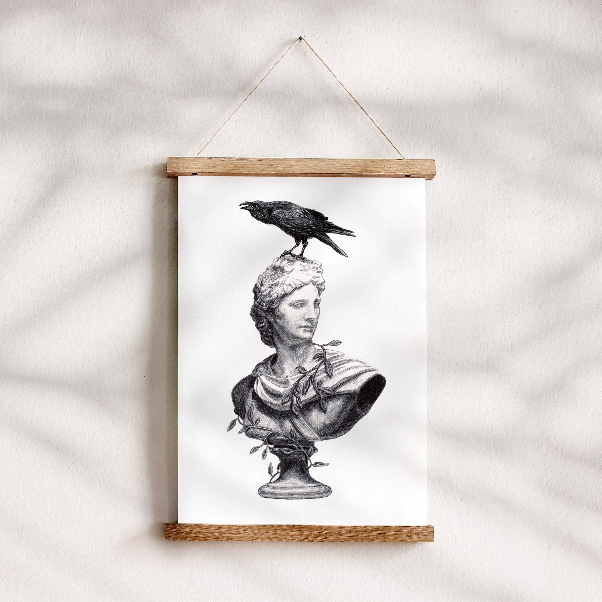 The inspiration for this piece came from the story of Apollo and the Raven from ancient Greek mythology. According to legend, Apollo sent out his white raven to spy on his lover, and when the bird came back with bad news about her fidelity, Apollo was so furious, he scorched the bird until its feathers turned black - which is why, as the legend goes, the ravens of today are black. (Ever heard of “don’t kill the messenger” Apollo?)