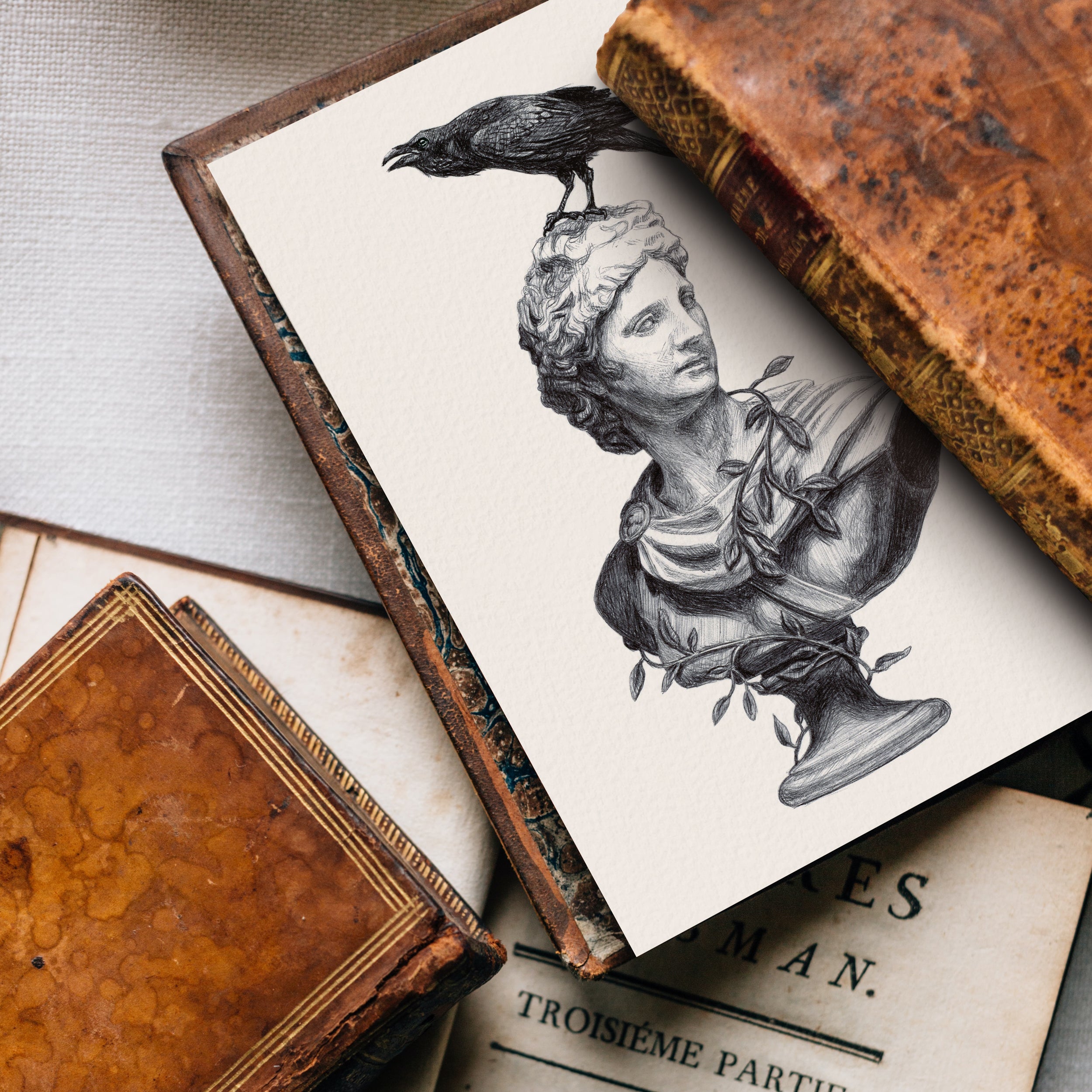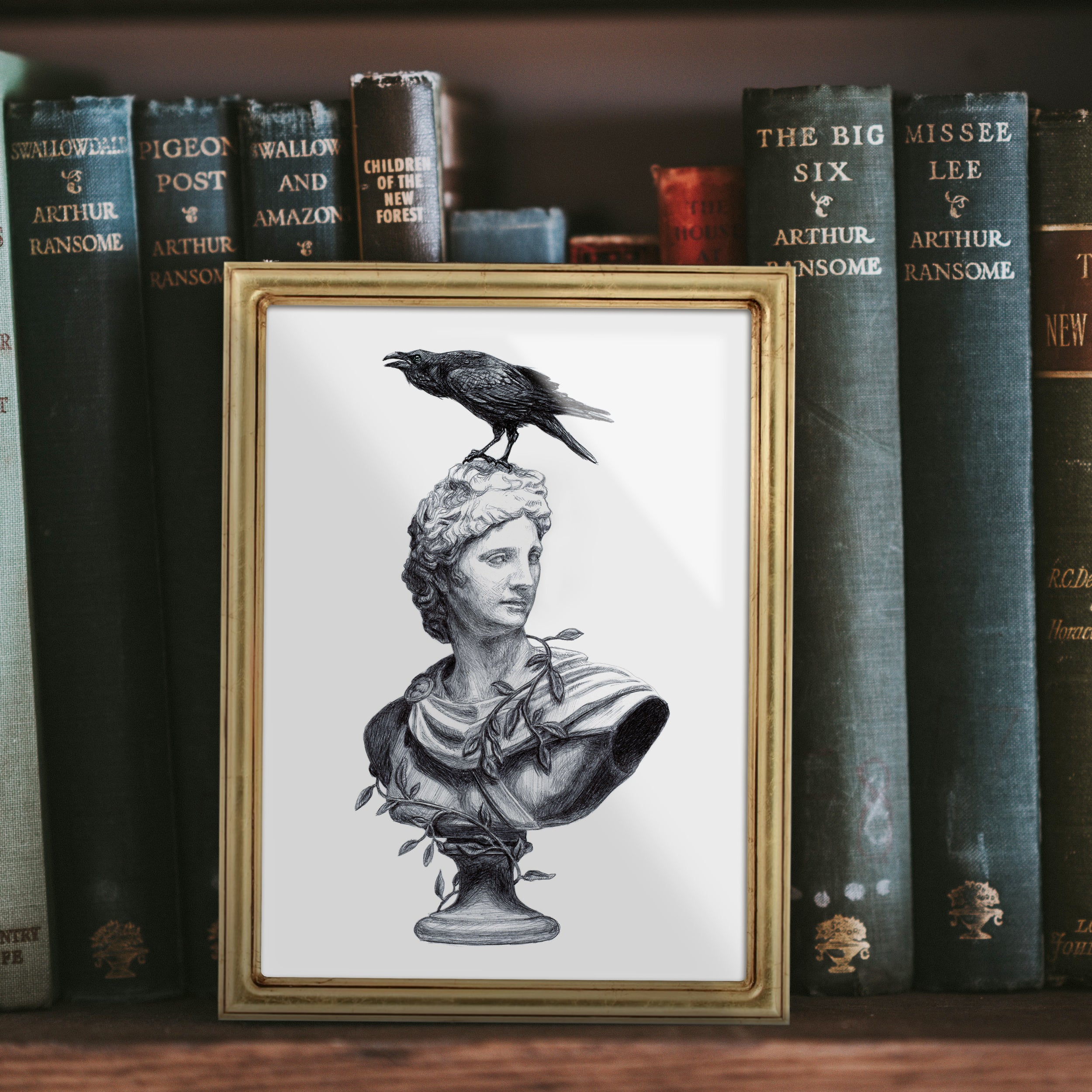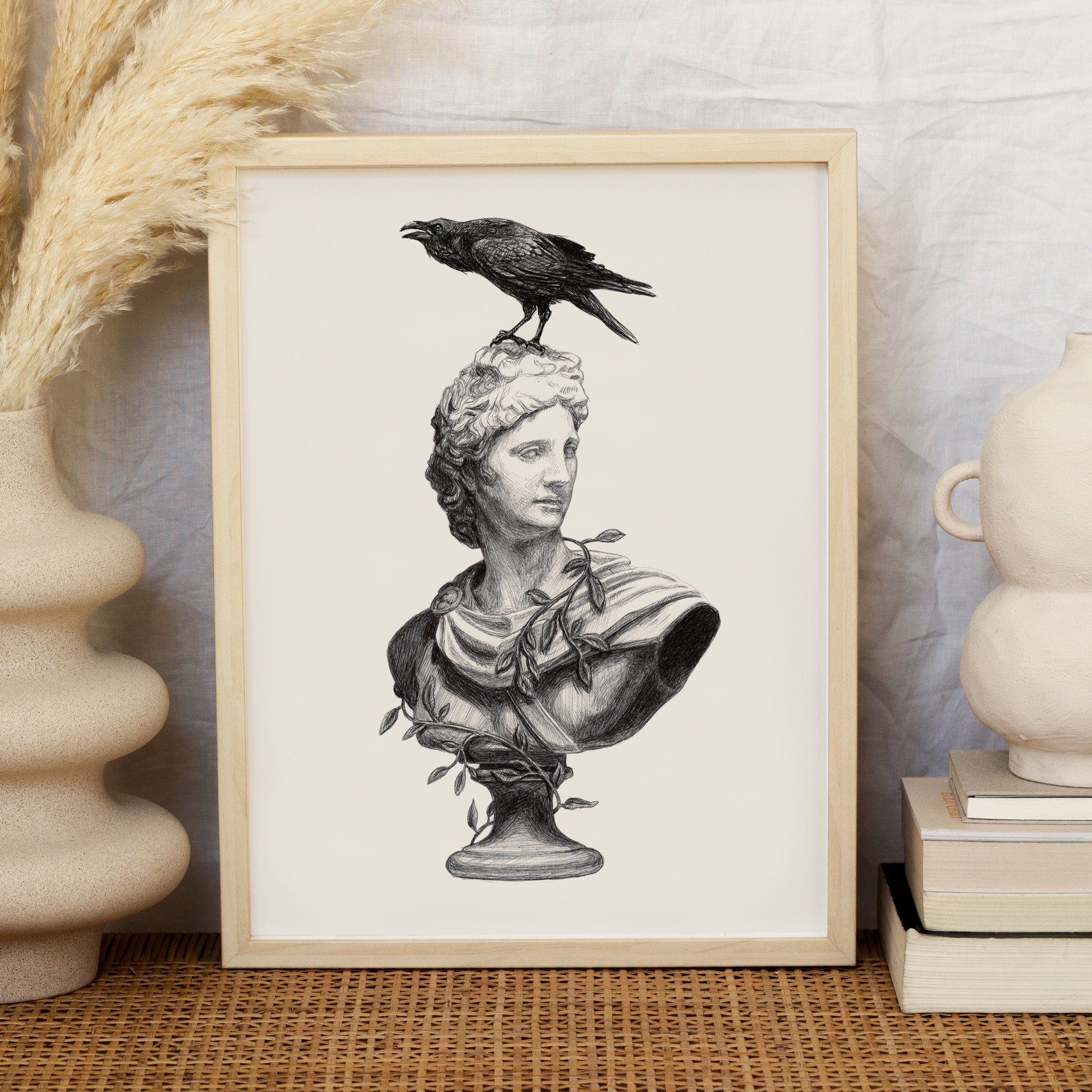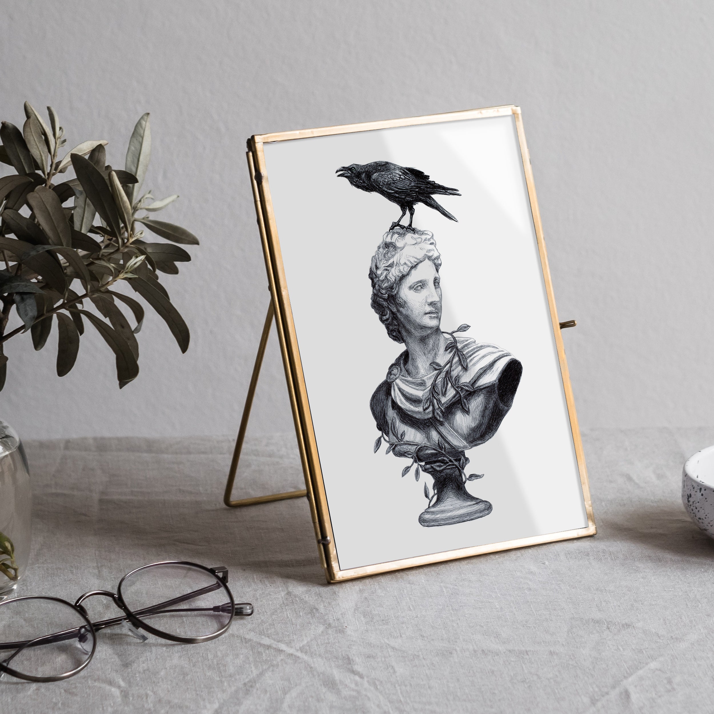 The inspiration for this piece came from the story of Apollo and the Raven from ancient Greek mythology. According to legend, Apollo sent out his white raven to spy on his lover, and when the bird came back with bad news about her fidelity, Apollo was so furious, he scorched the bird until its feathers turned black - which is why, as the legend goes, the ravens of today are black. (Ever heard of “don’t kill the messenger” Apollo?)