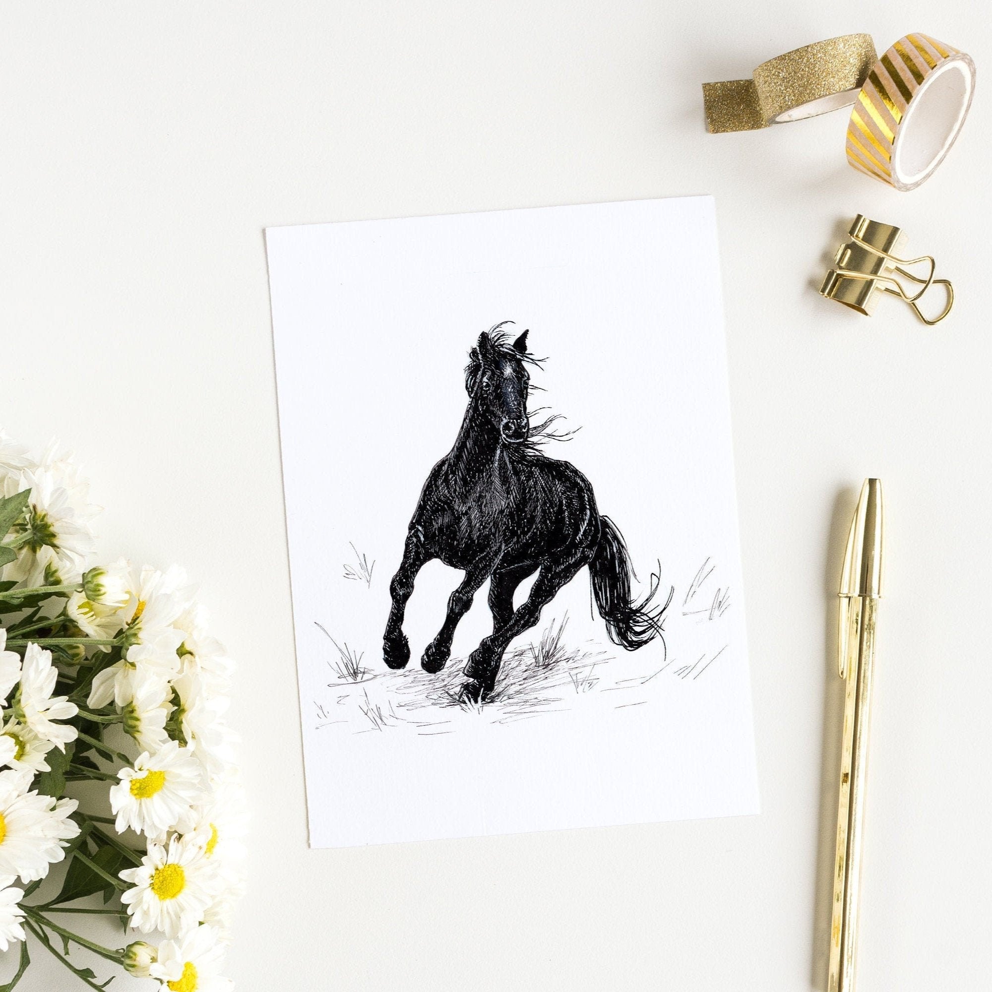 I created the original artwork as part of a series on Classic Stories. I drew inspiration from “Black Beauty, His Grooms and Companions; The Autobiography of a Horse” by Anna Sewell, for this particular piece. It was created using ink on watercolor paper.