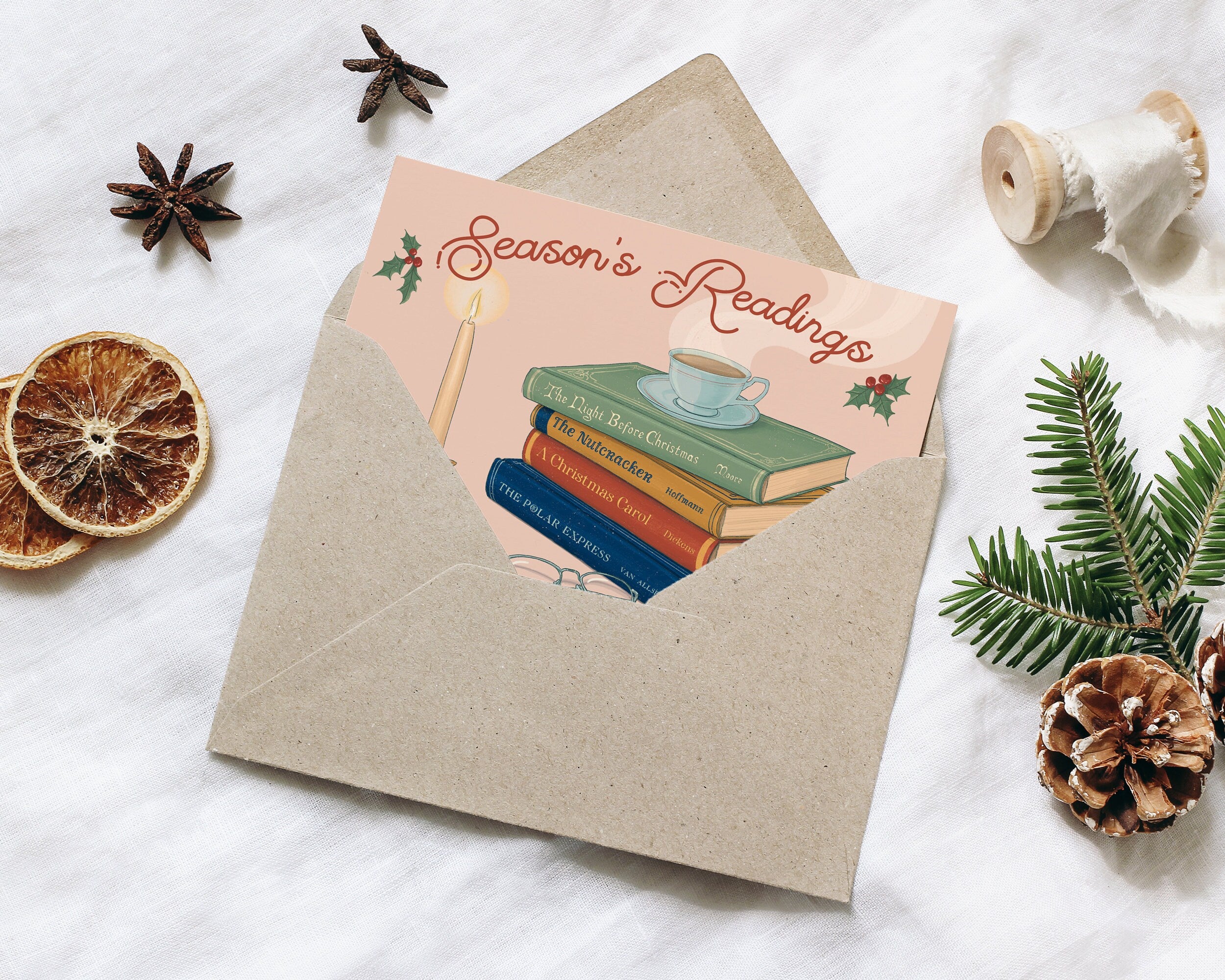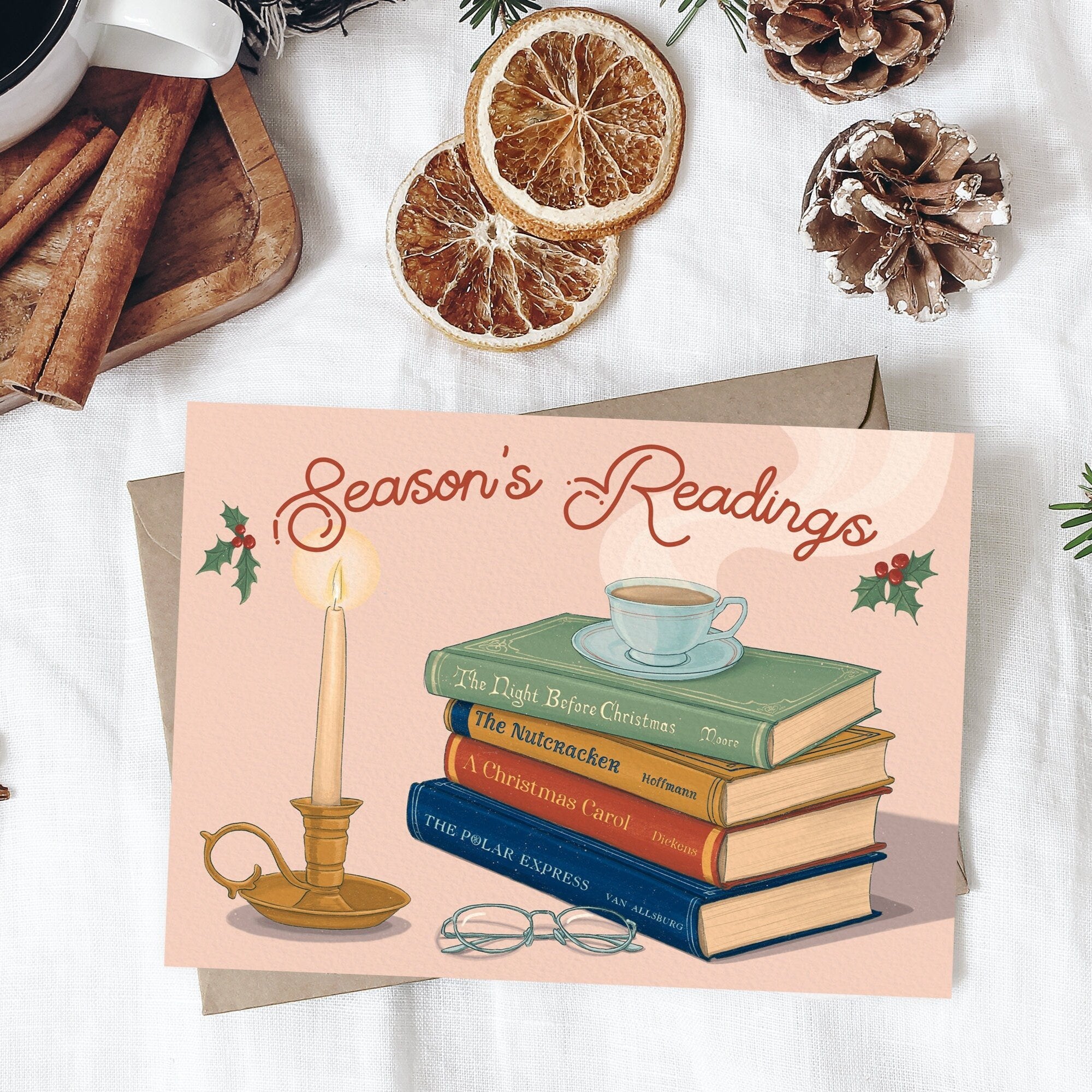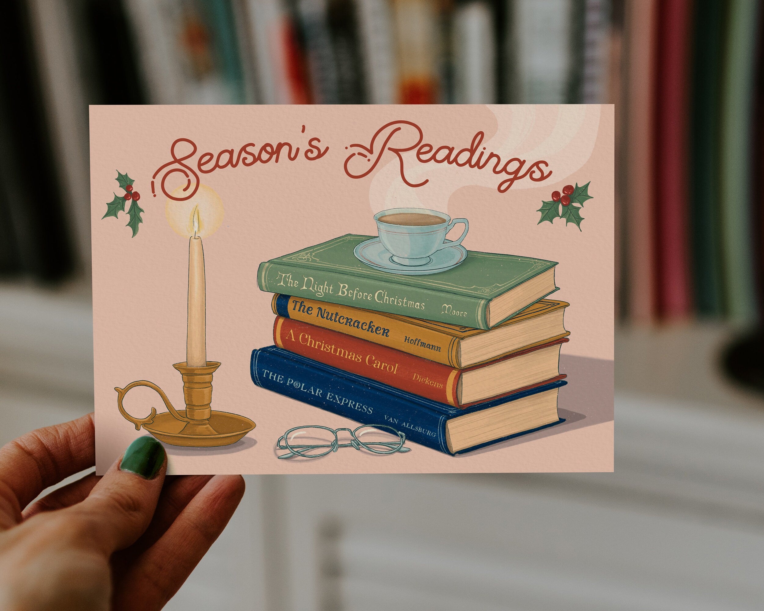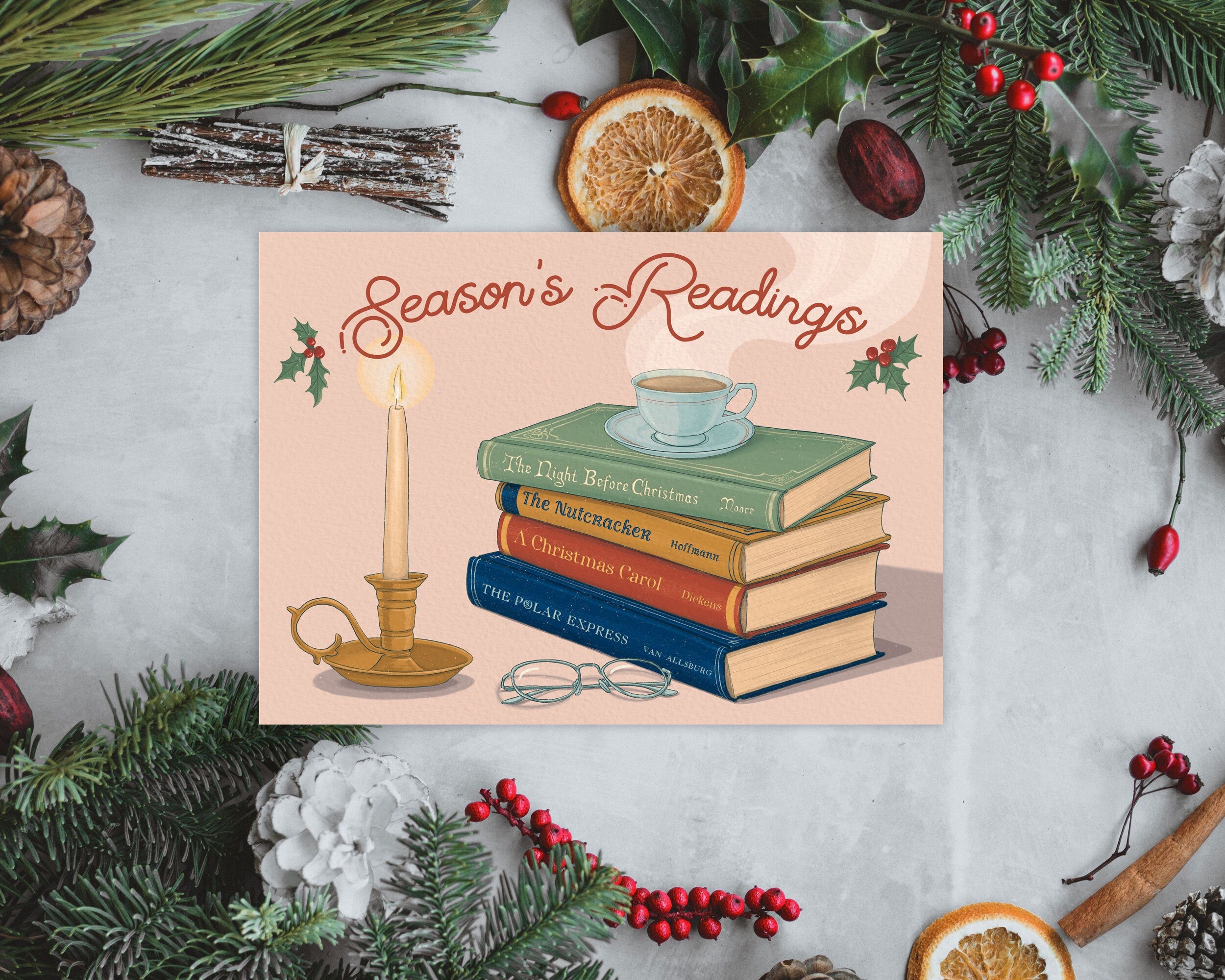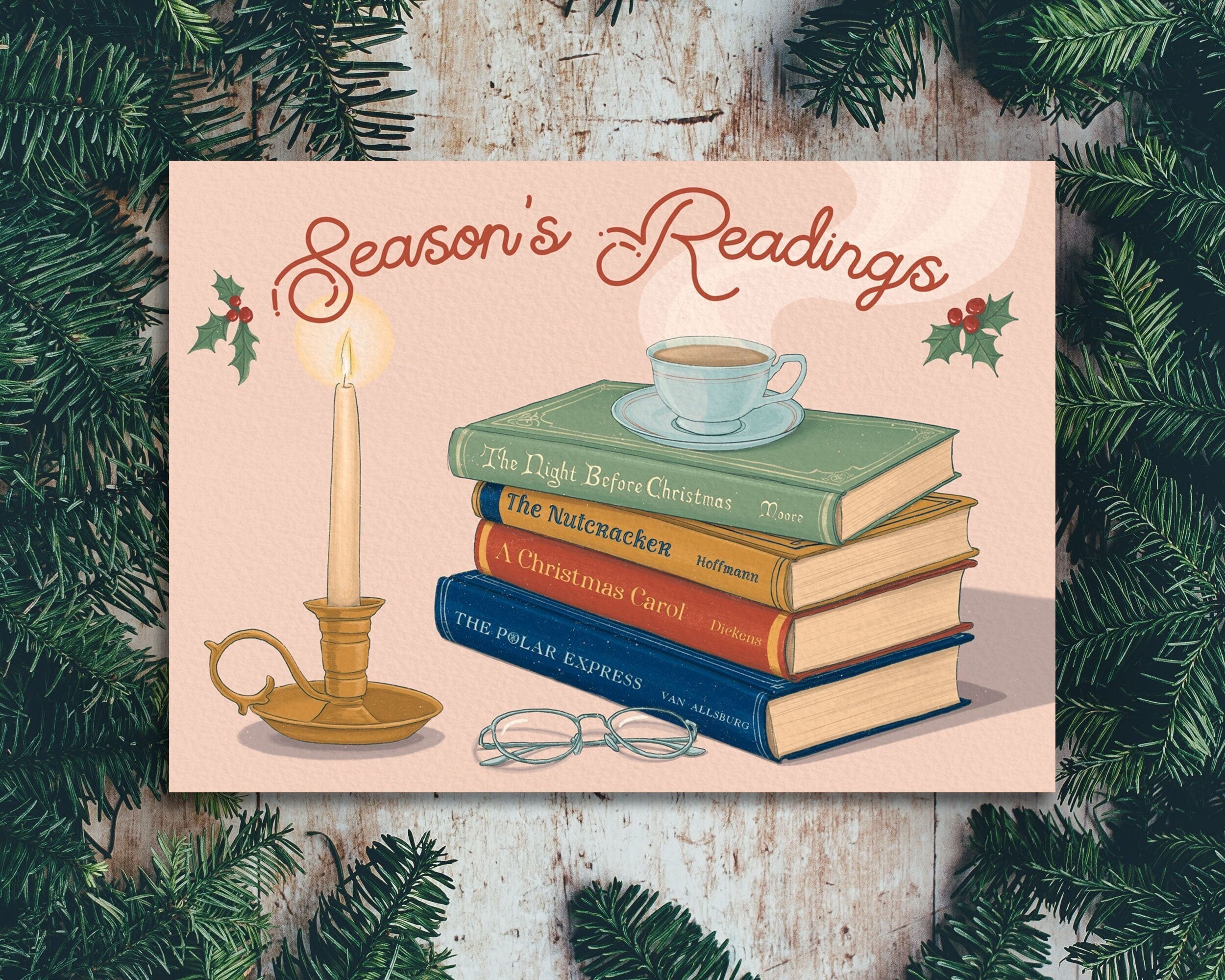 Delight the bookworm, librarian or book club member in your life with a handmade holiday card. The illustration was born out of my love for classic Christmas stories, such as A Christmas Carol, The Nutcracker, The Night Before Christmas, and The Polar Express!