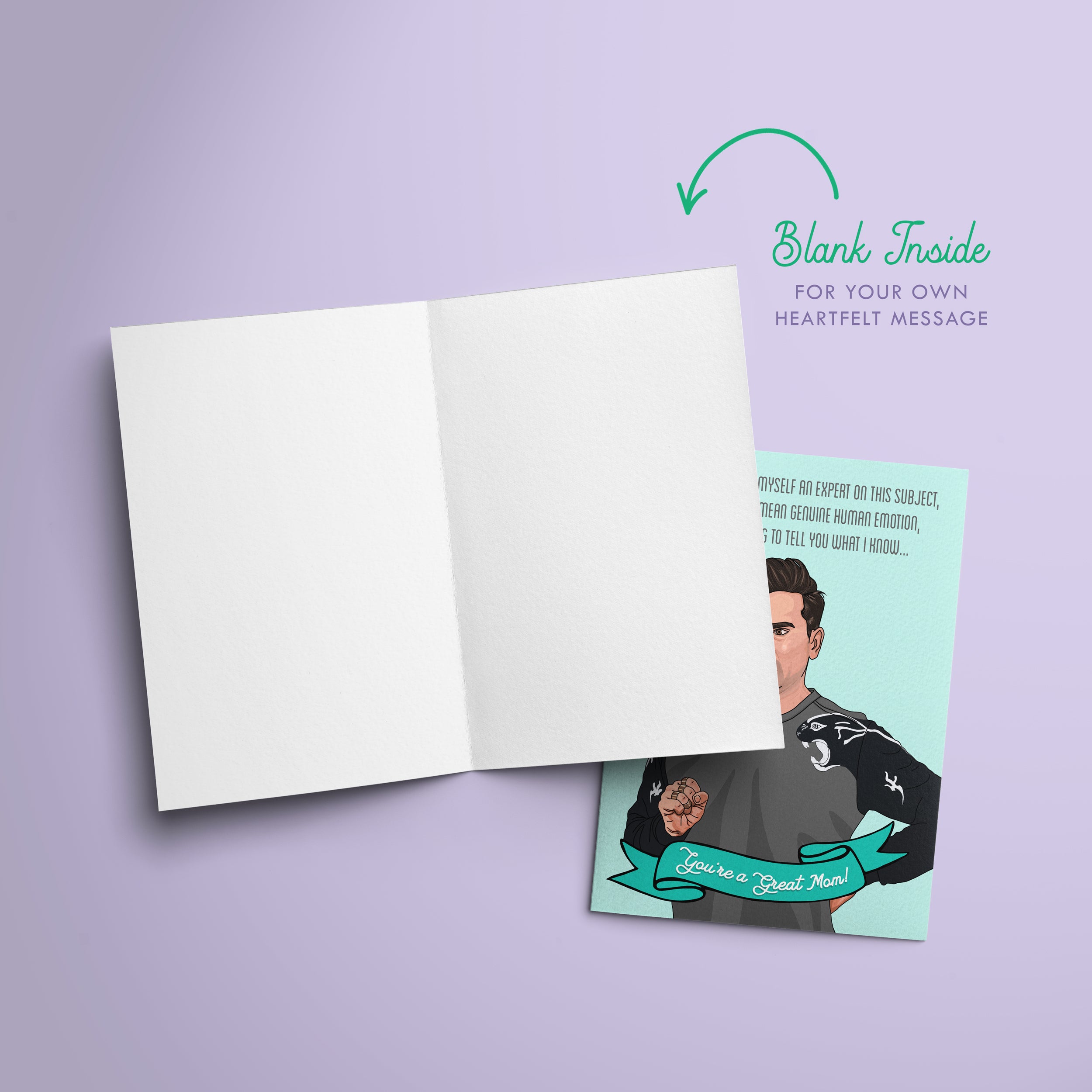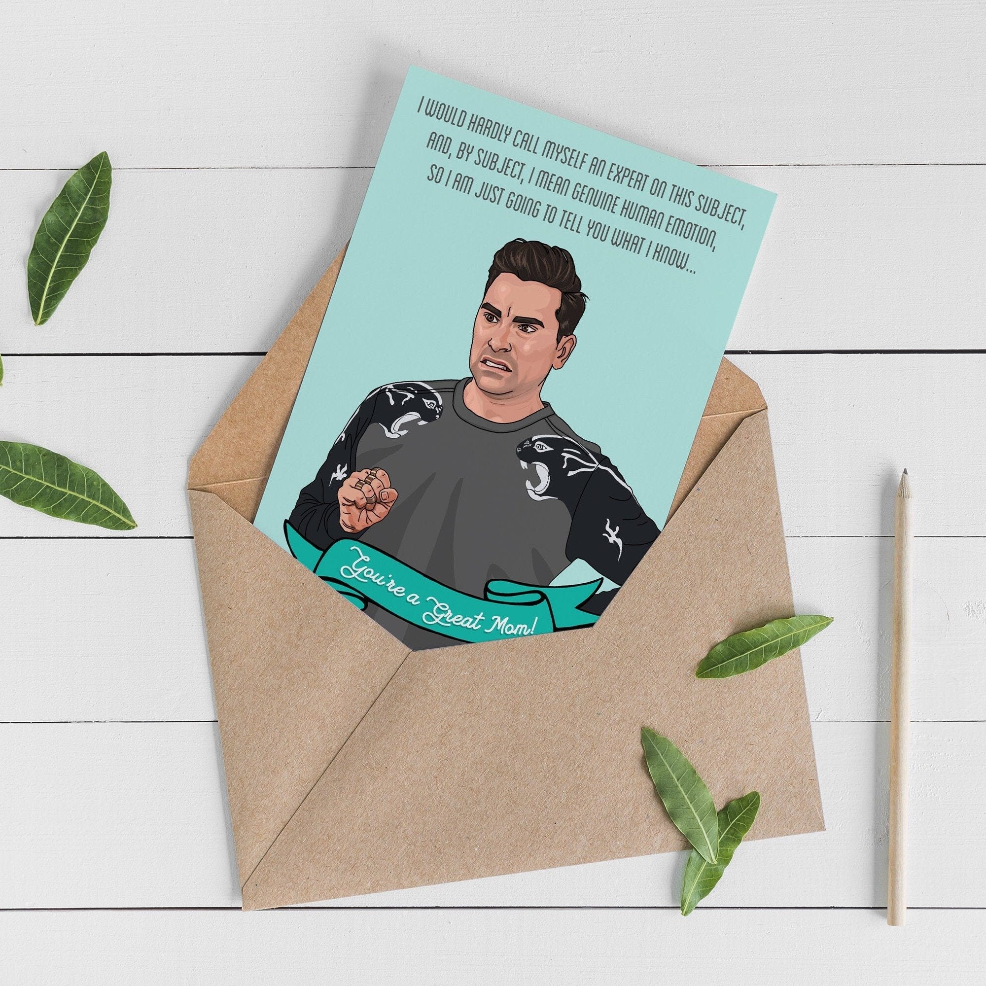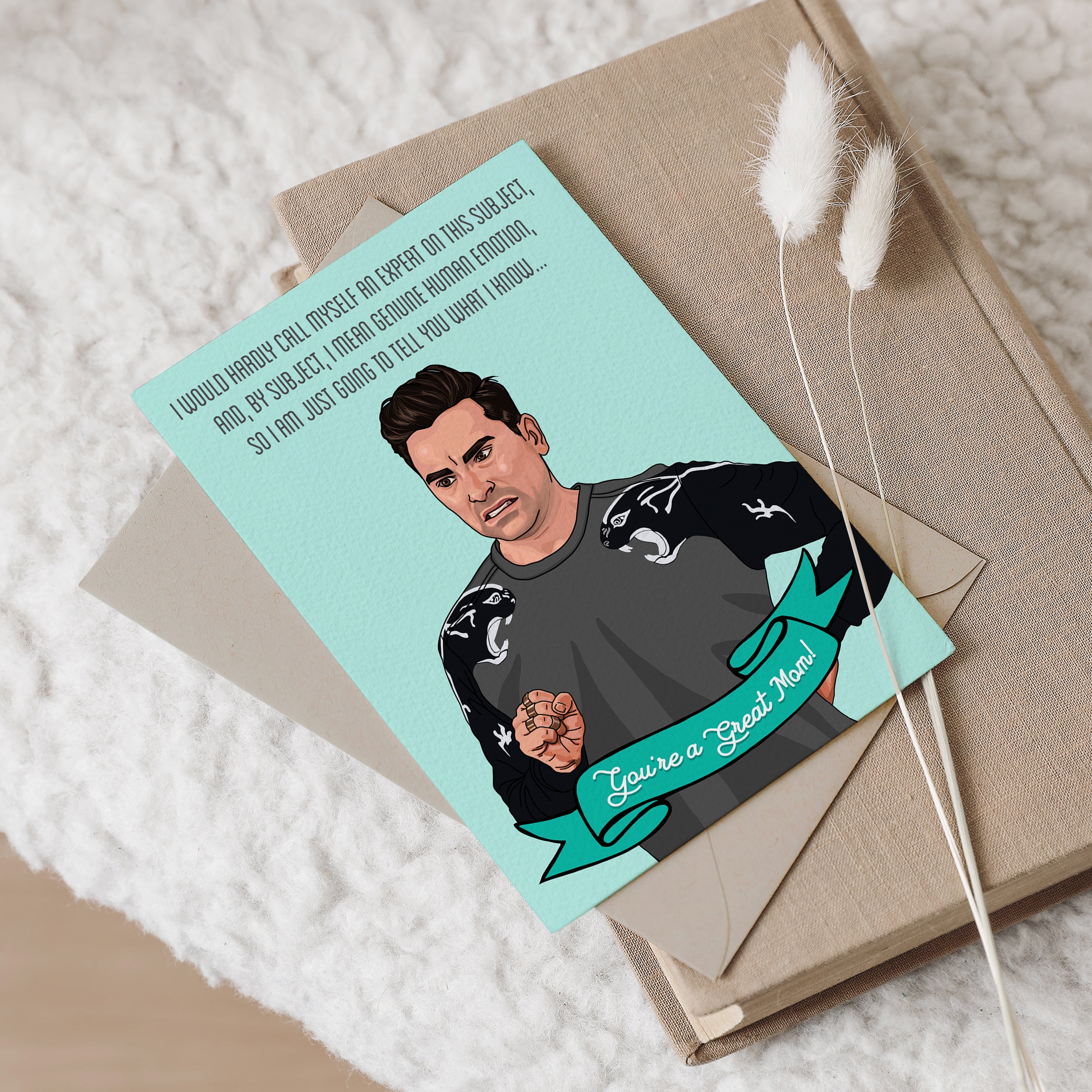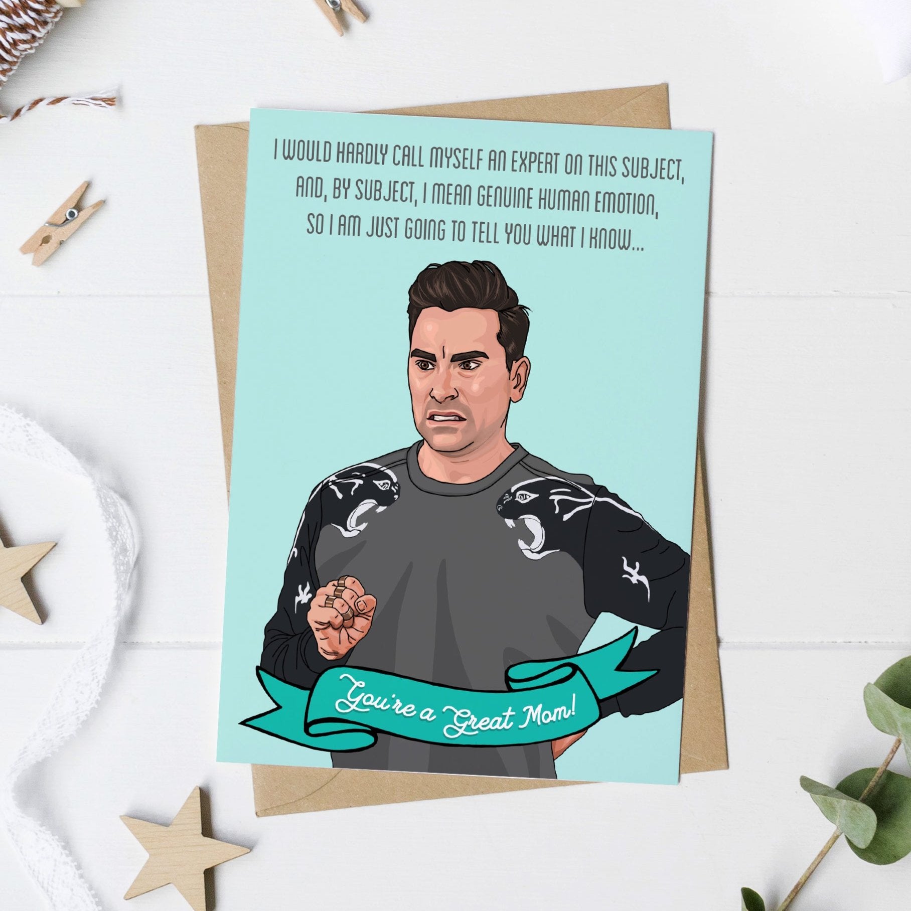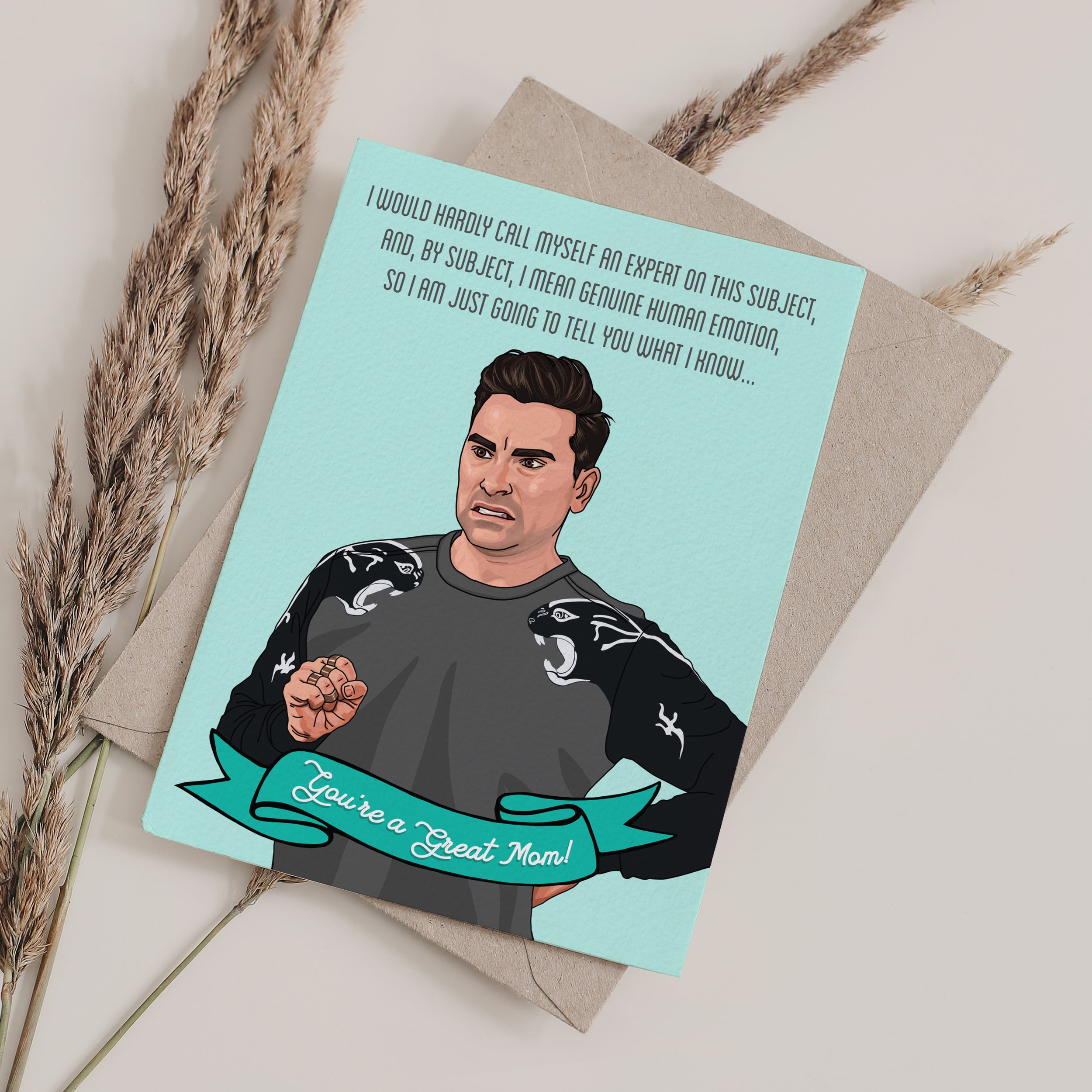 Show your mom or someone like a mother to you, how much you appreciate them while making them laugh at the same time with this funny handmade Mother’s Day Card featuring the hilariously awkward David Rose from the show Schitt’s Creek.