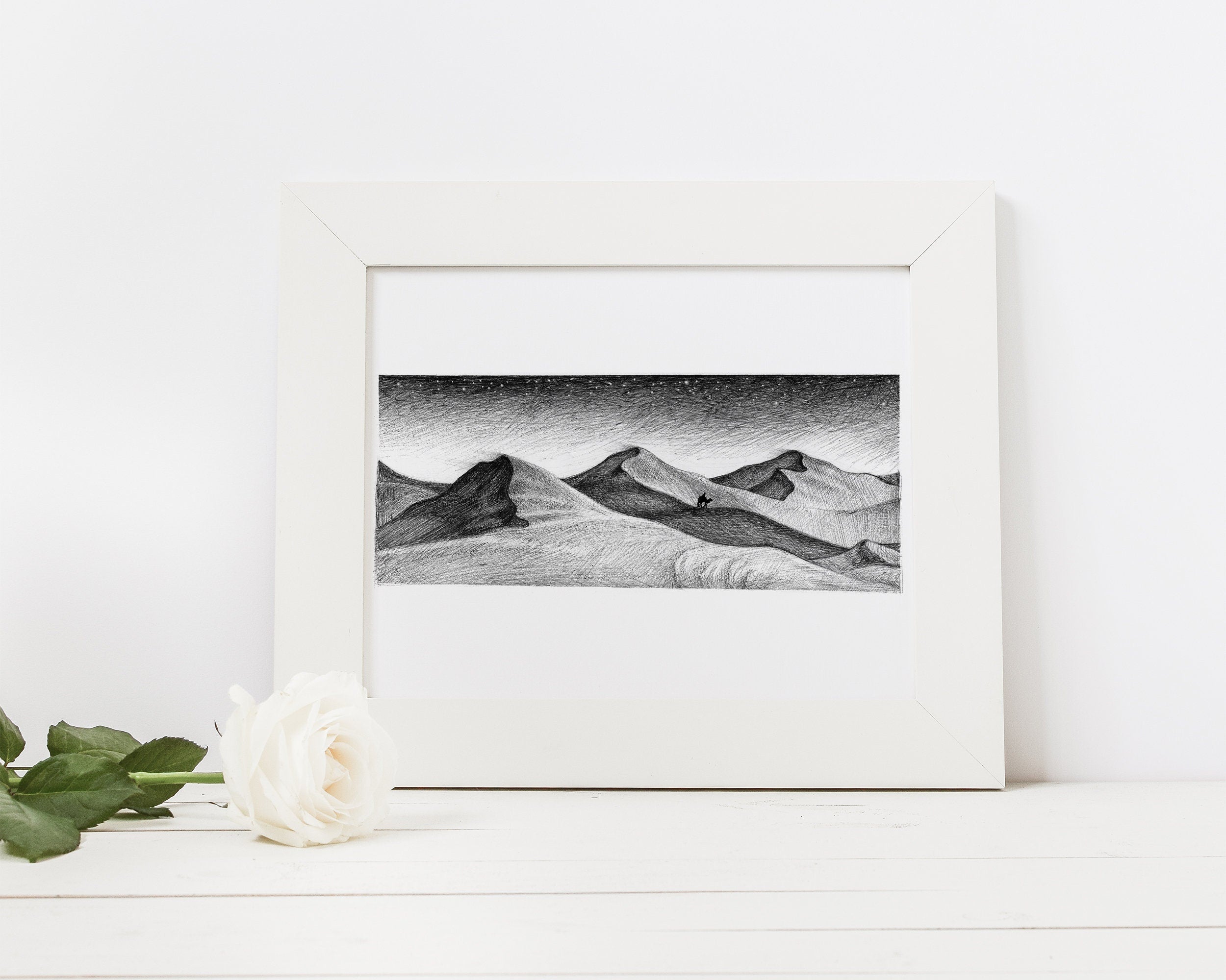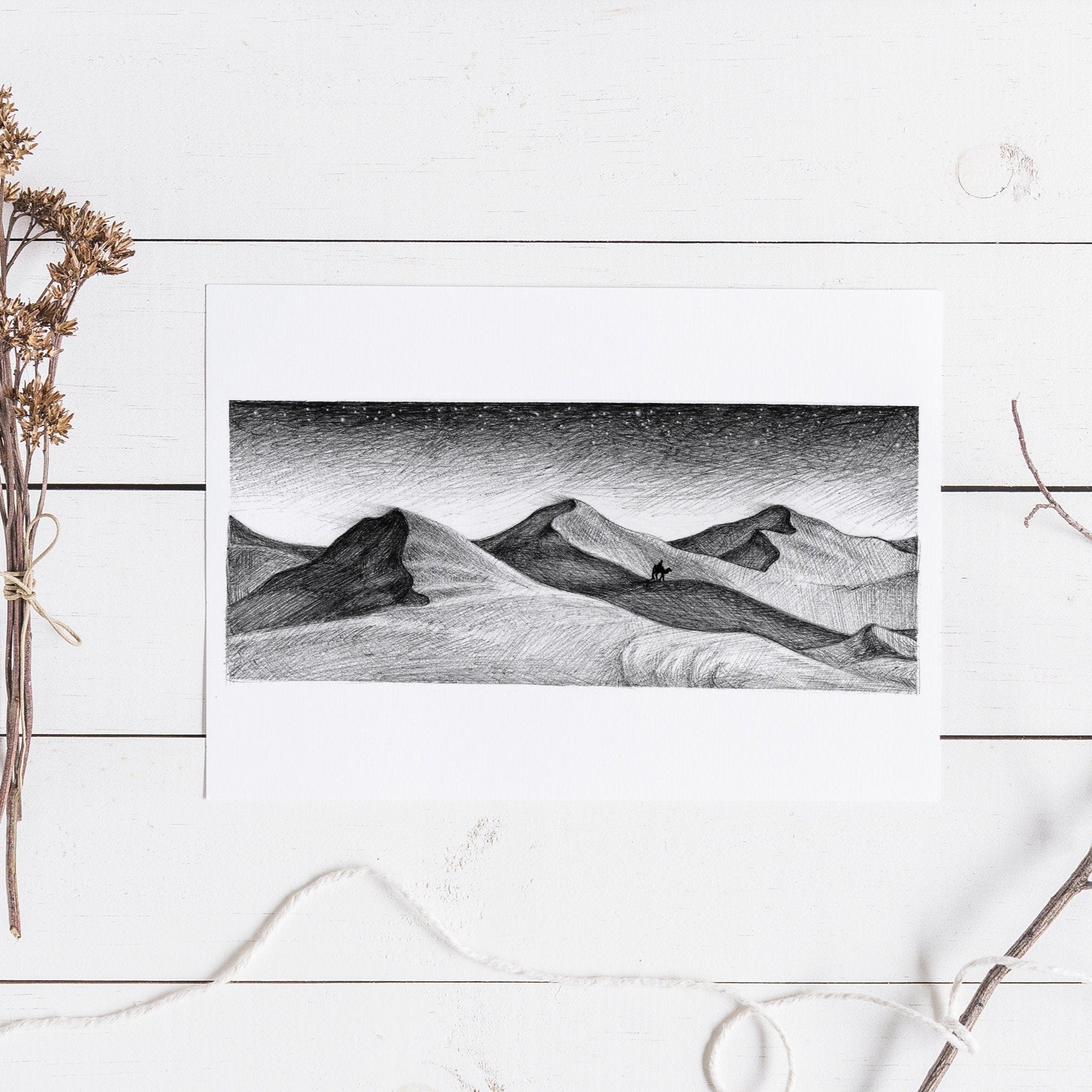 I created the original artwork using ink and features a vast desert of endless sand dunes and a small camel and rider silhouetted in the distance.