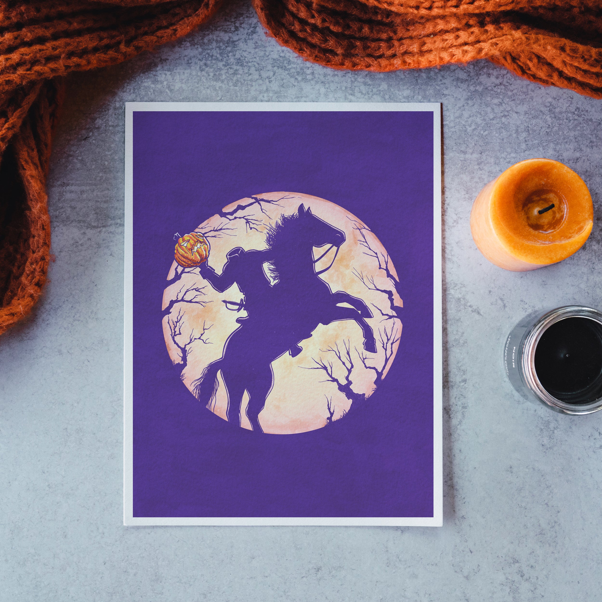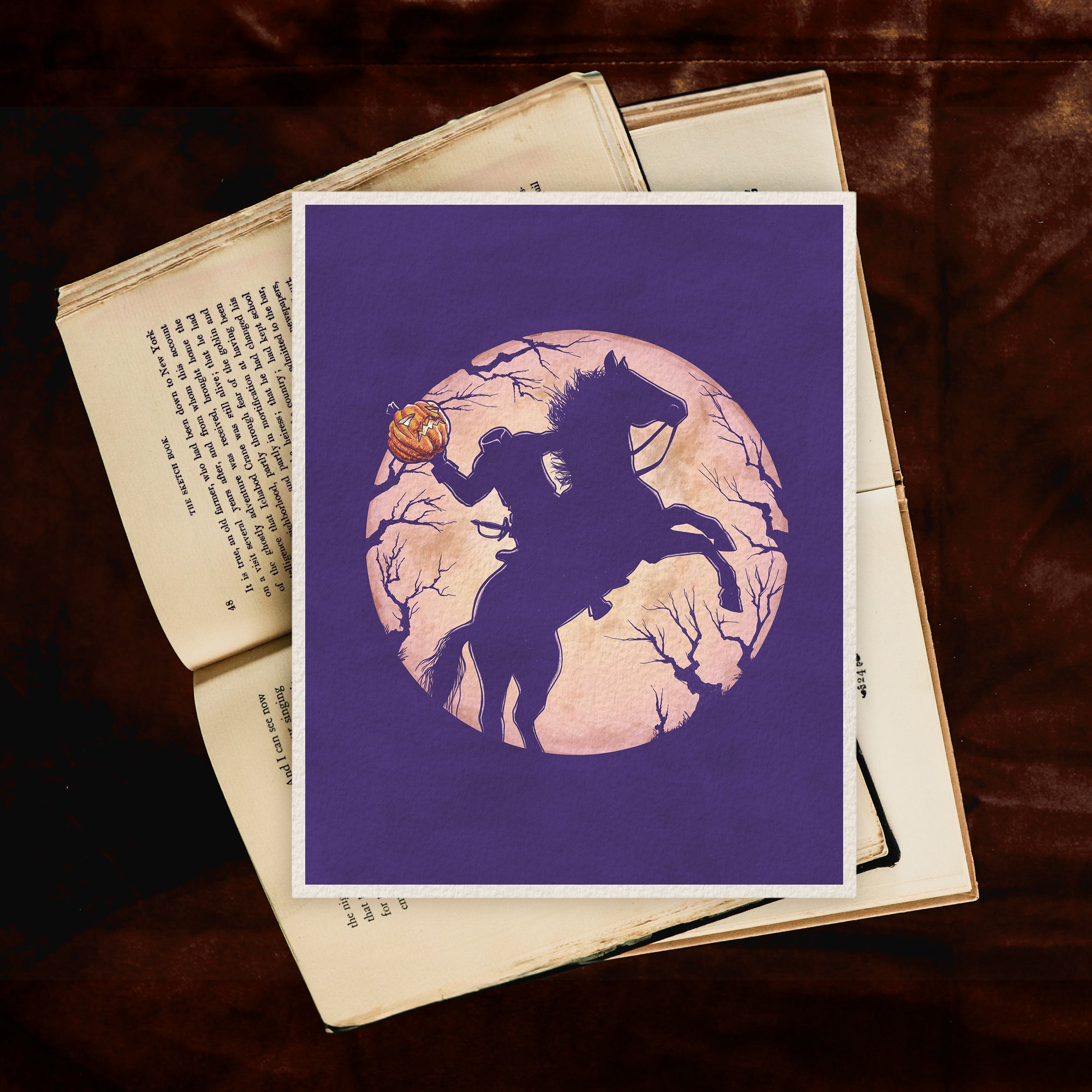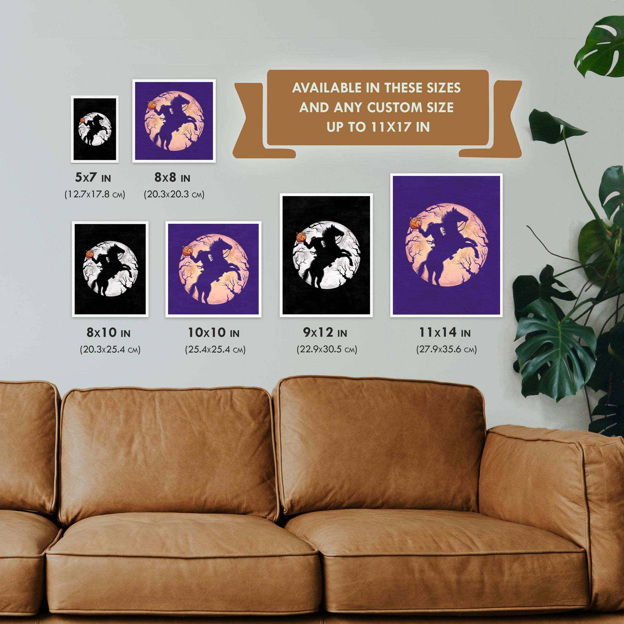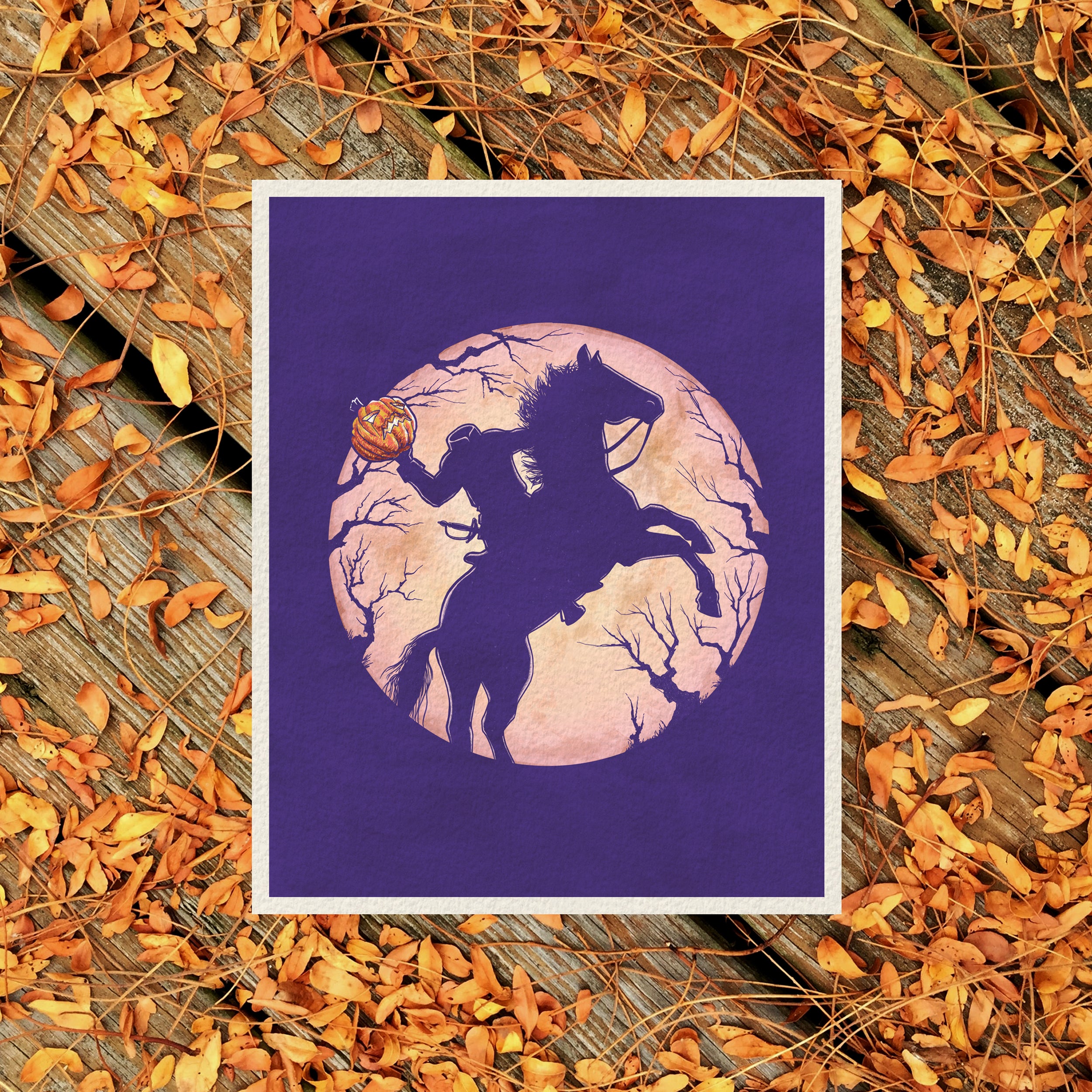 Enjoy the Spooky Season all year long with The Headless Horseman silhouetted by a full moon on Halloween night! Inspired by Washington Irving's 1820 ghost story “The Legend of Sleepy Hollow," I created the original artwork using ink on watercolor paper, and afterward manipulated the colors digitally to create a 2nd option in purple for those who love a little whimsy to their Halloween!