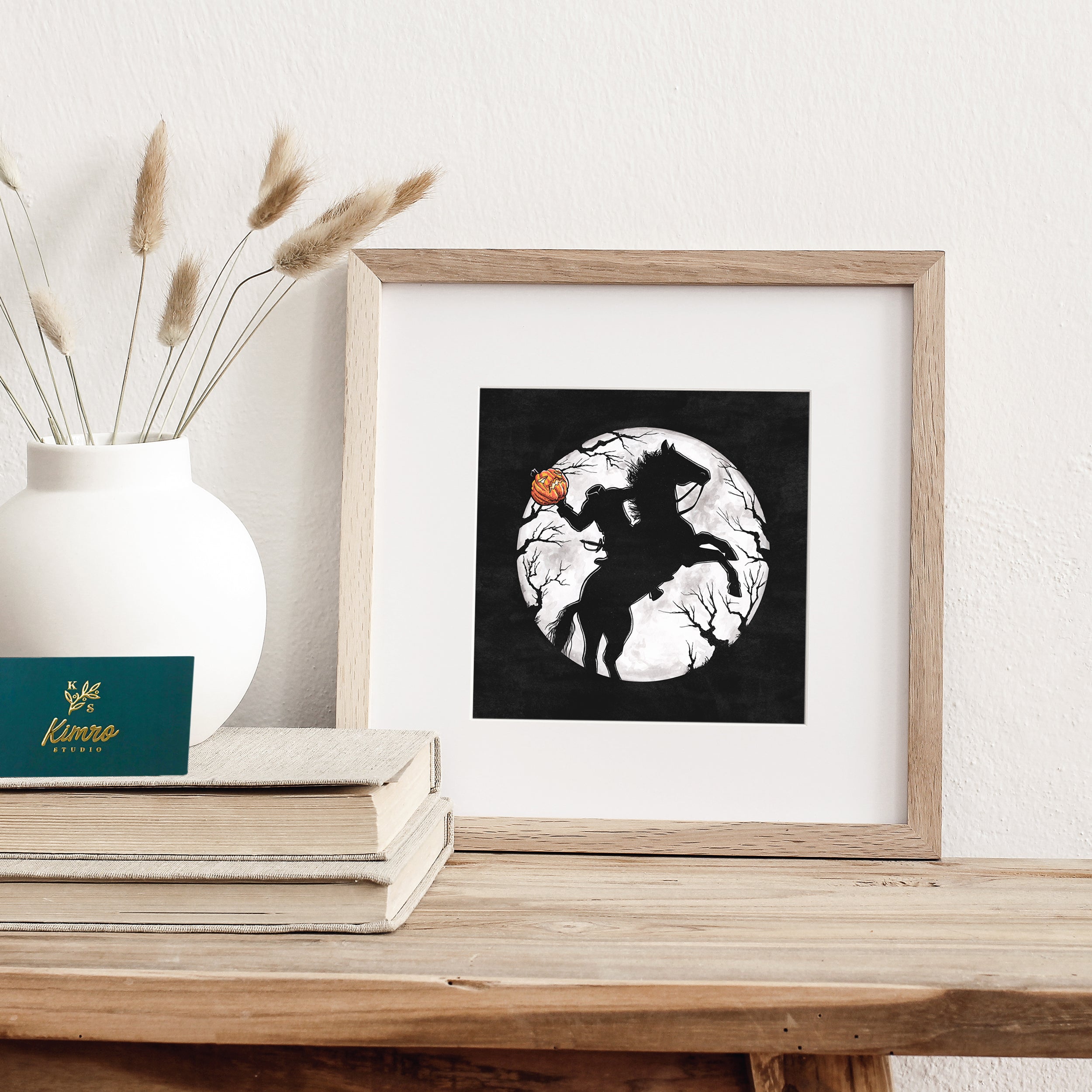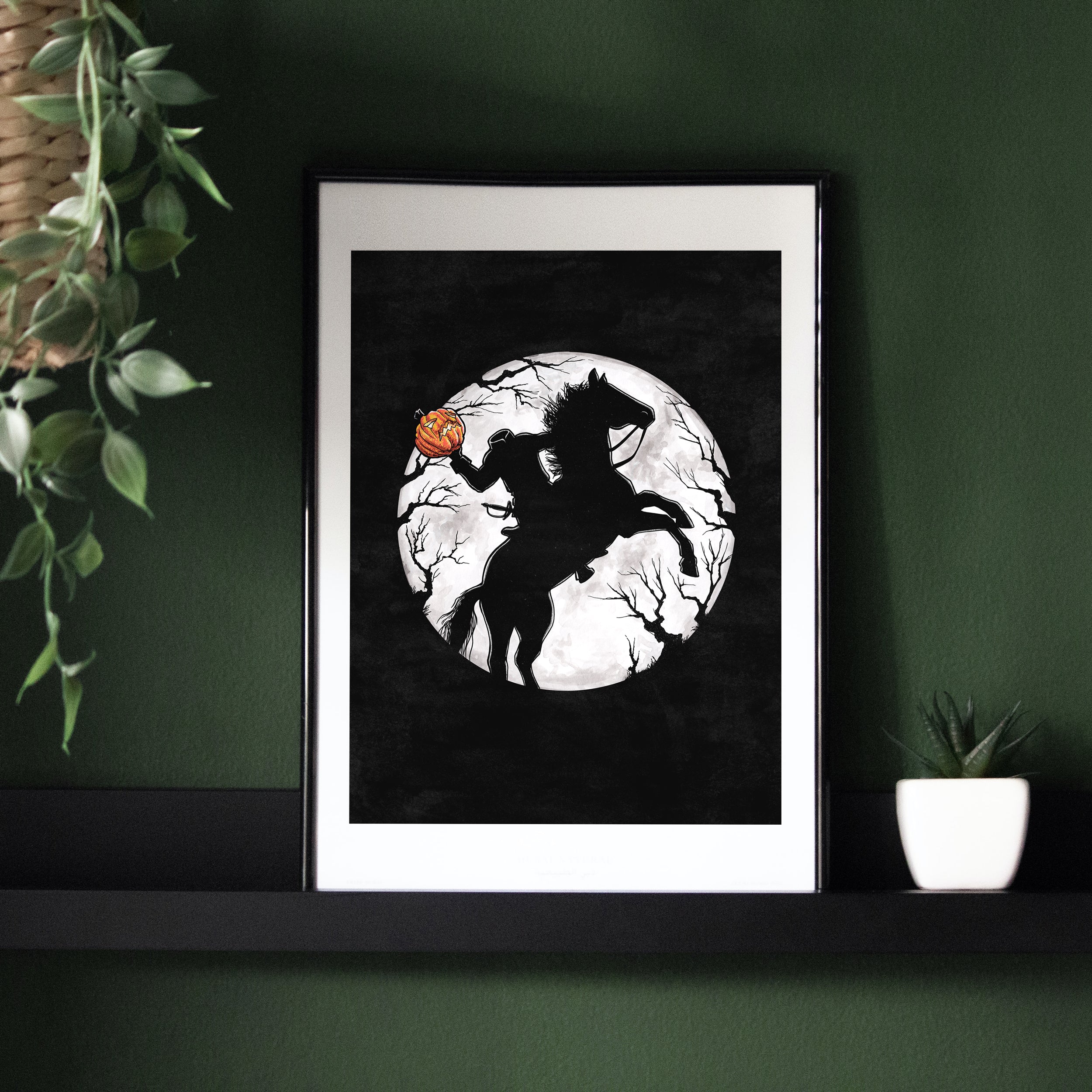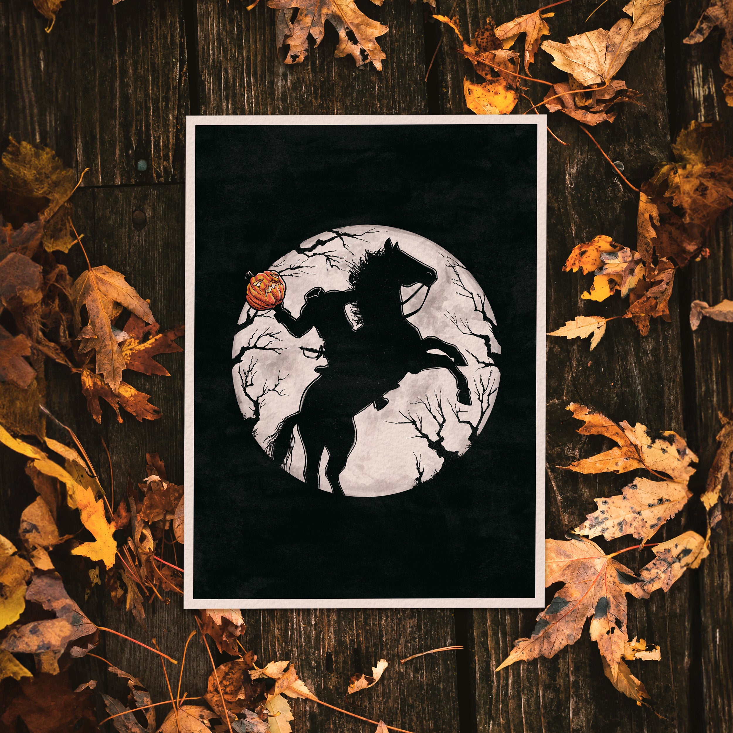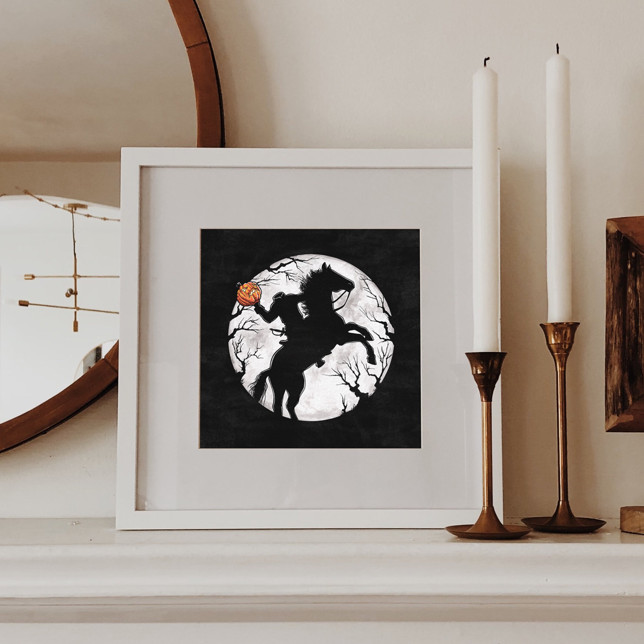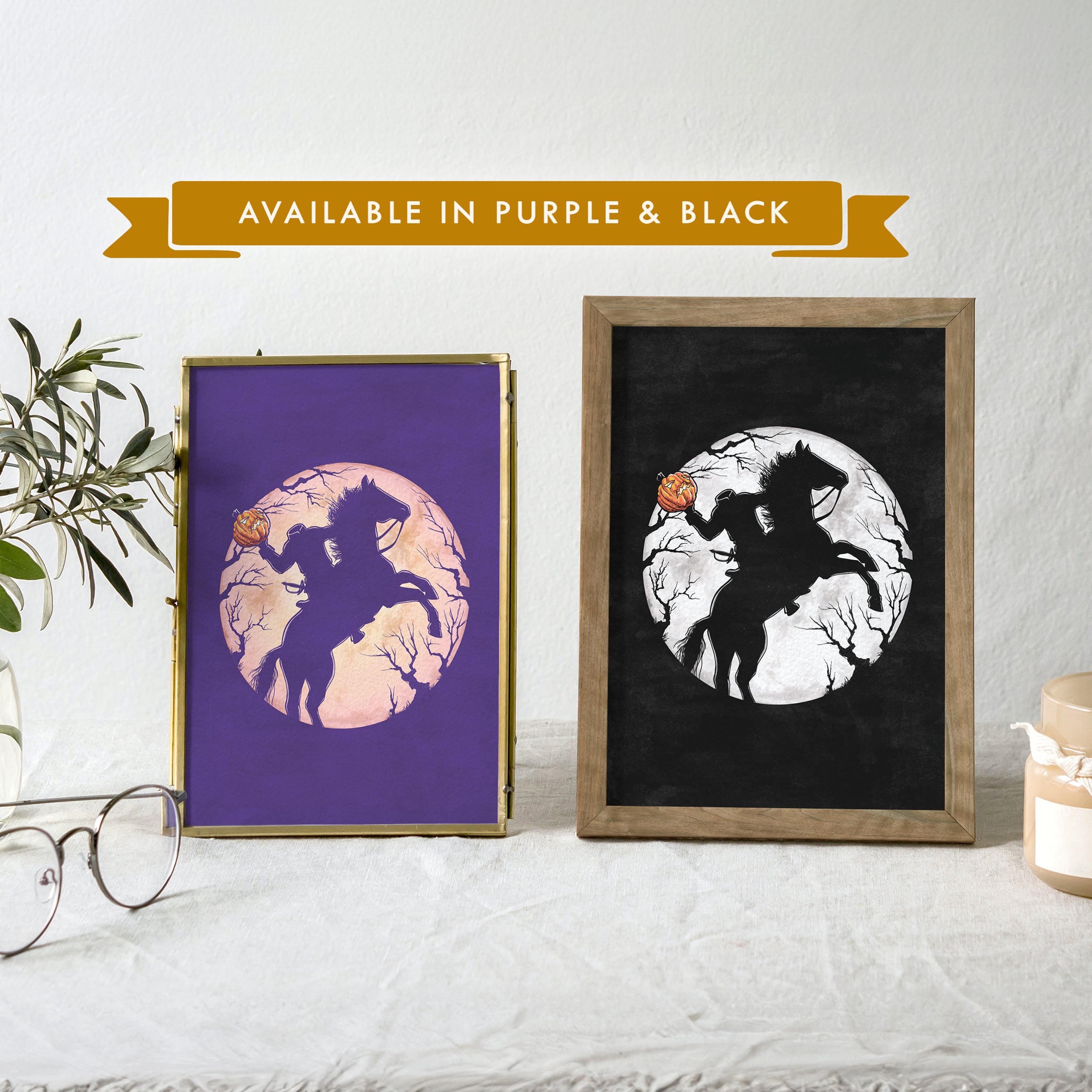 Enjoy the Spooky Season all year long with The Headless Horseman silhouetted by a full moon on Halloween night! Inspired by Washington Irving's 1820 ghost story “The Legend of Sleepy Hollow," I created the original artwork using ink on watercolor paper, and afterward manipulated the colors digitally to create a 2nd option in purple for those who love a little whimsy to their Halloween!