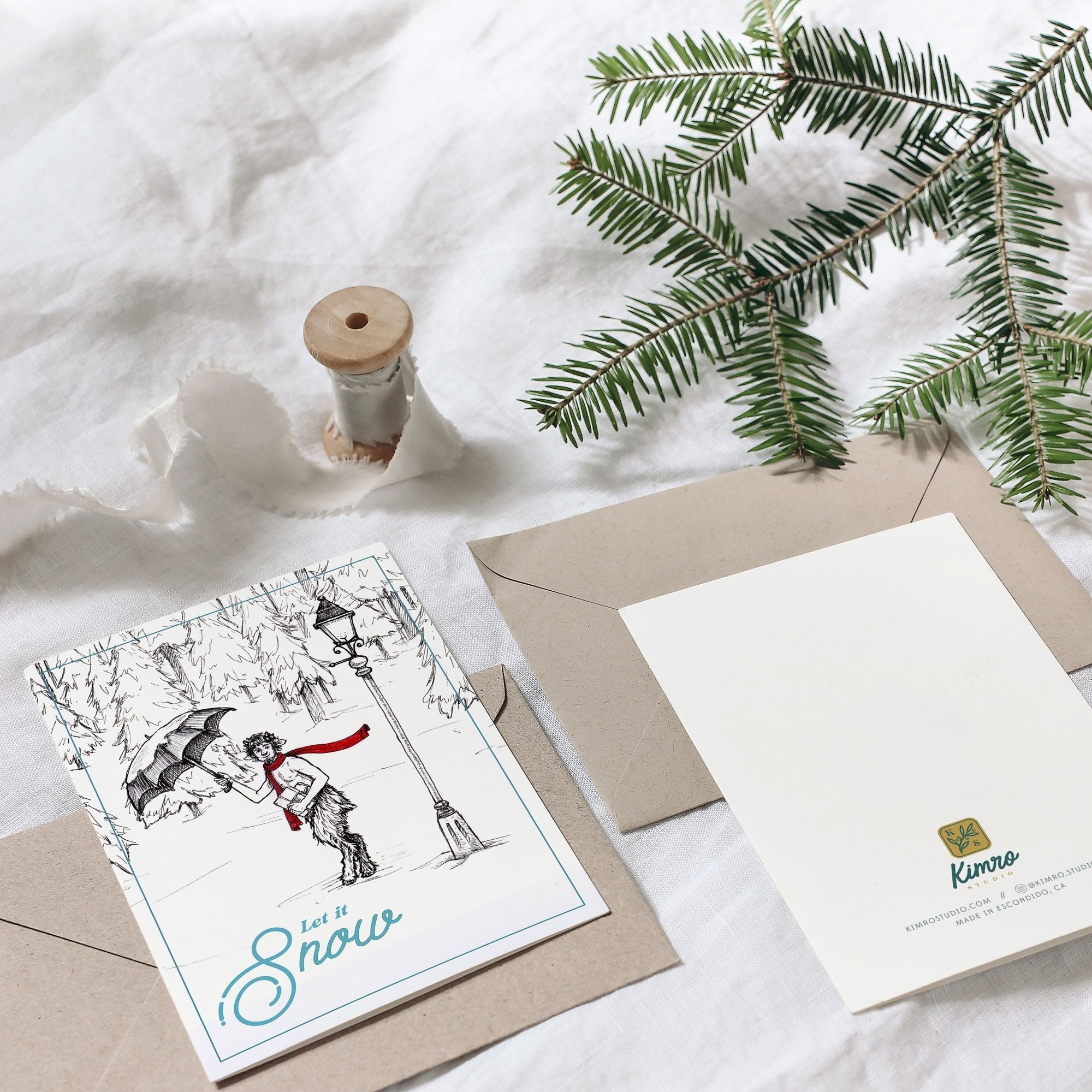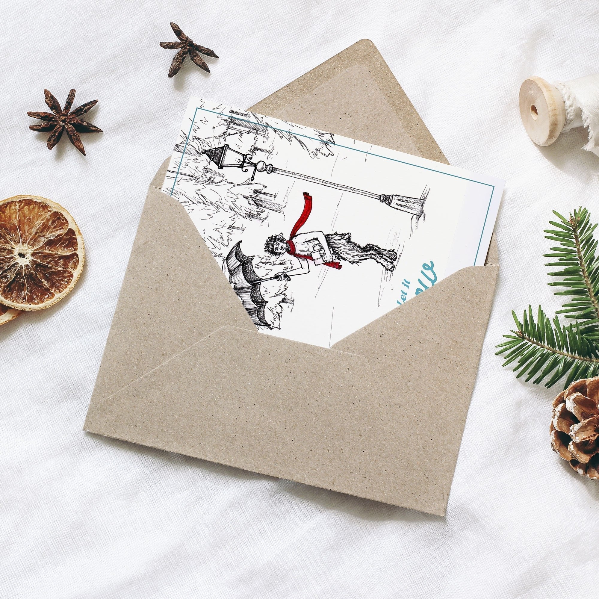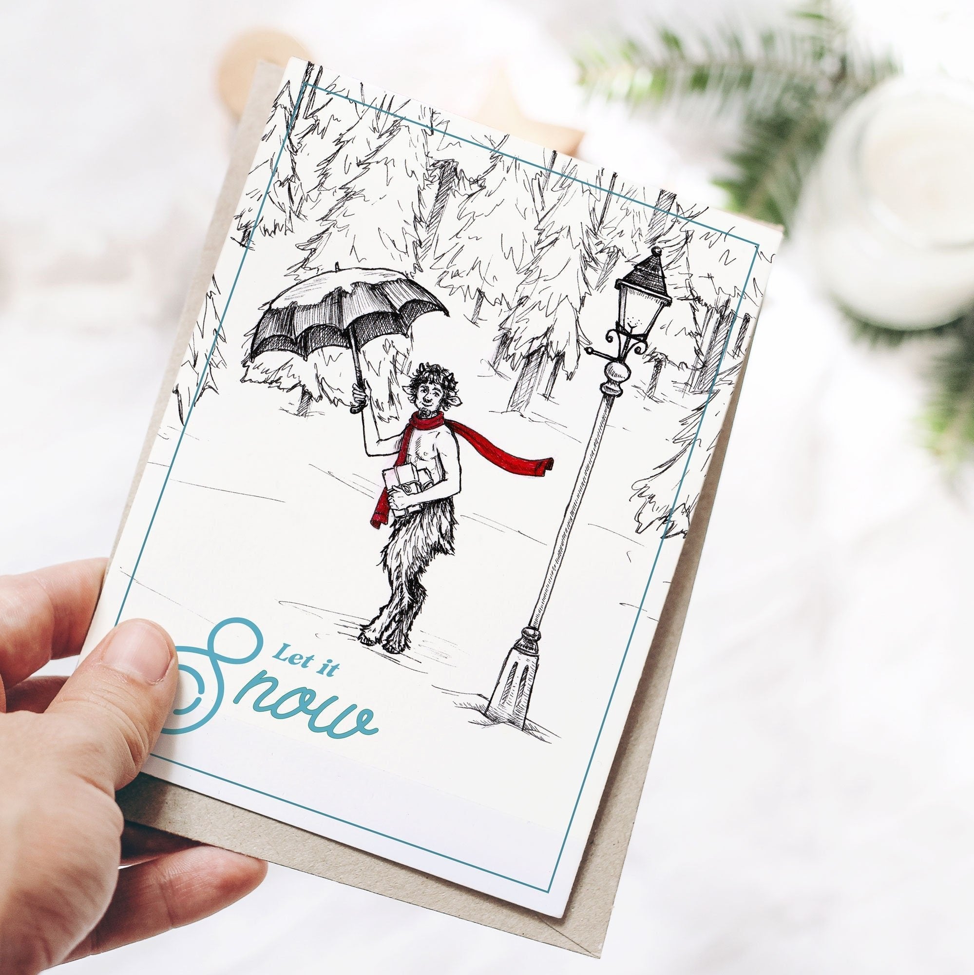 Share the magic of the Holiday season with a handmade holiday card featuring Mr. Tumnus at the lamppost in the wintery woods of Narnia (inspired by C.S. Lewis's classic: The Lion, the Witch, and the Wardrobe).