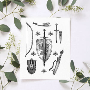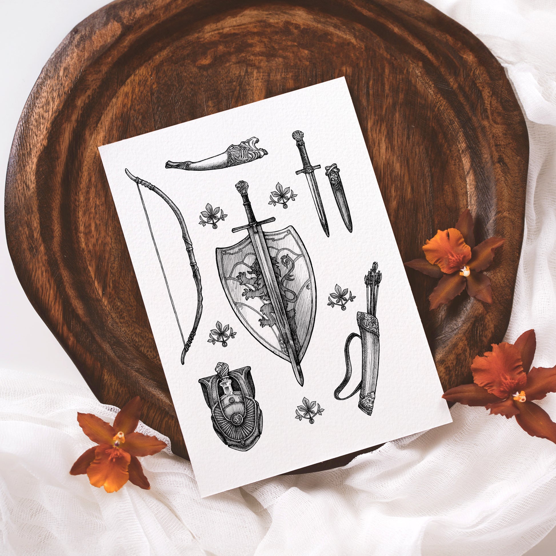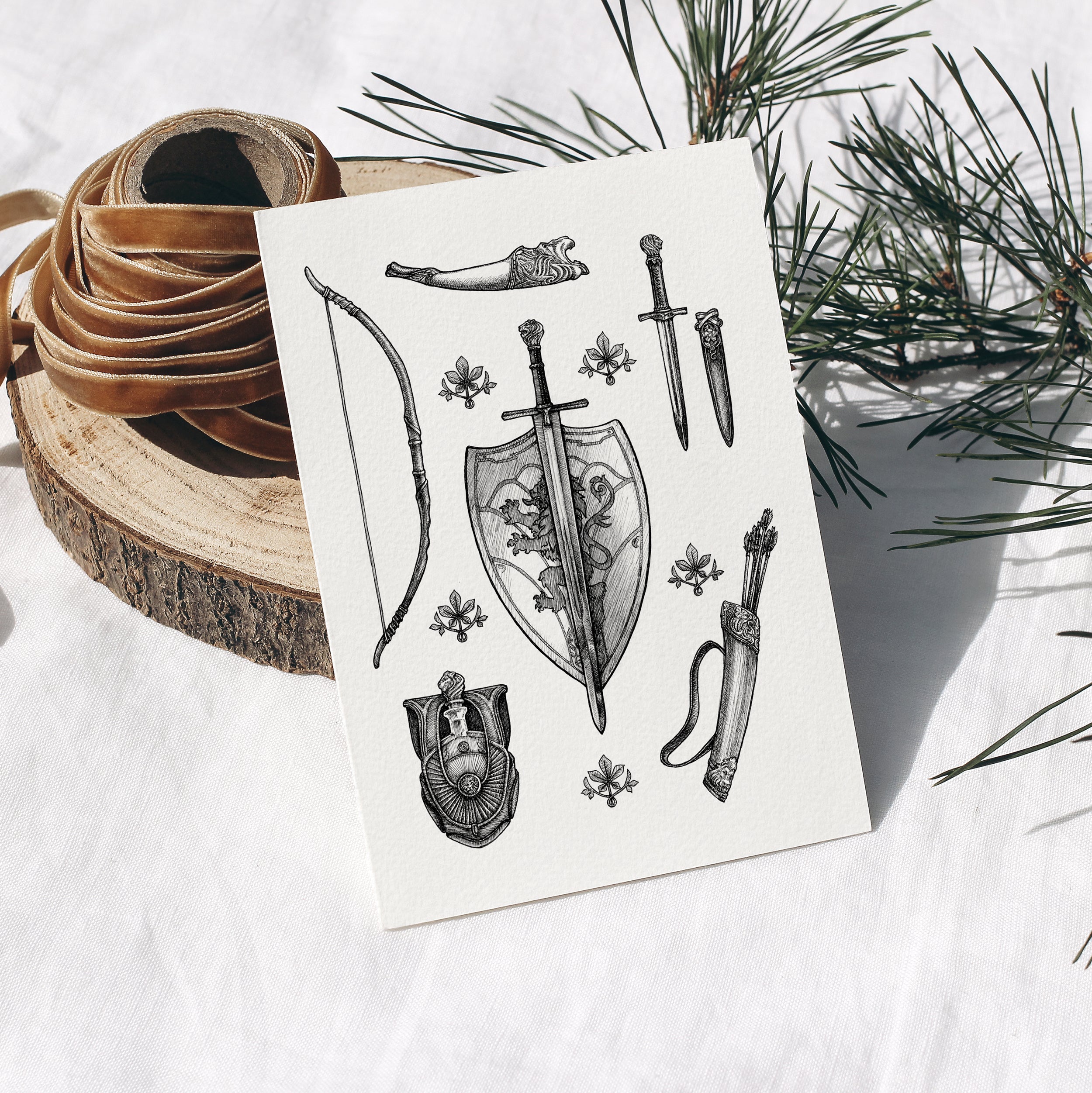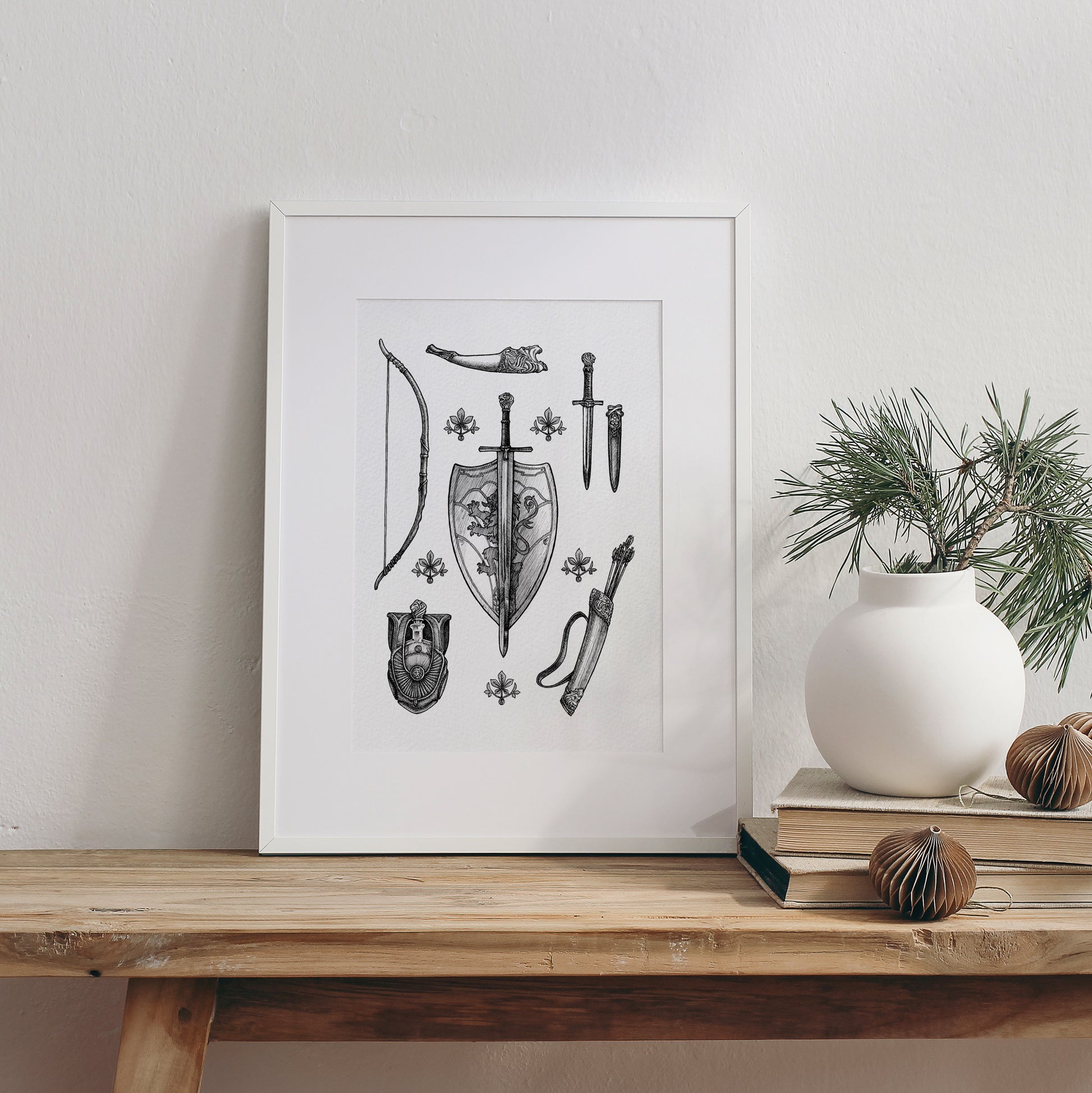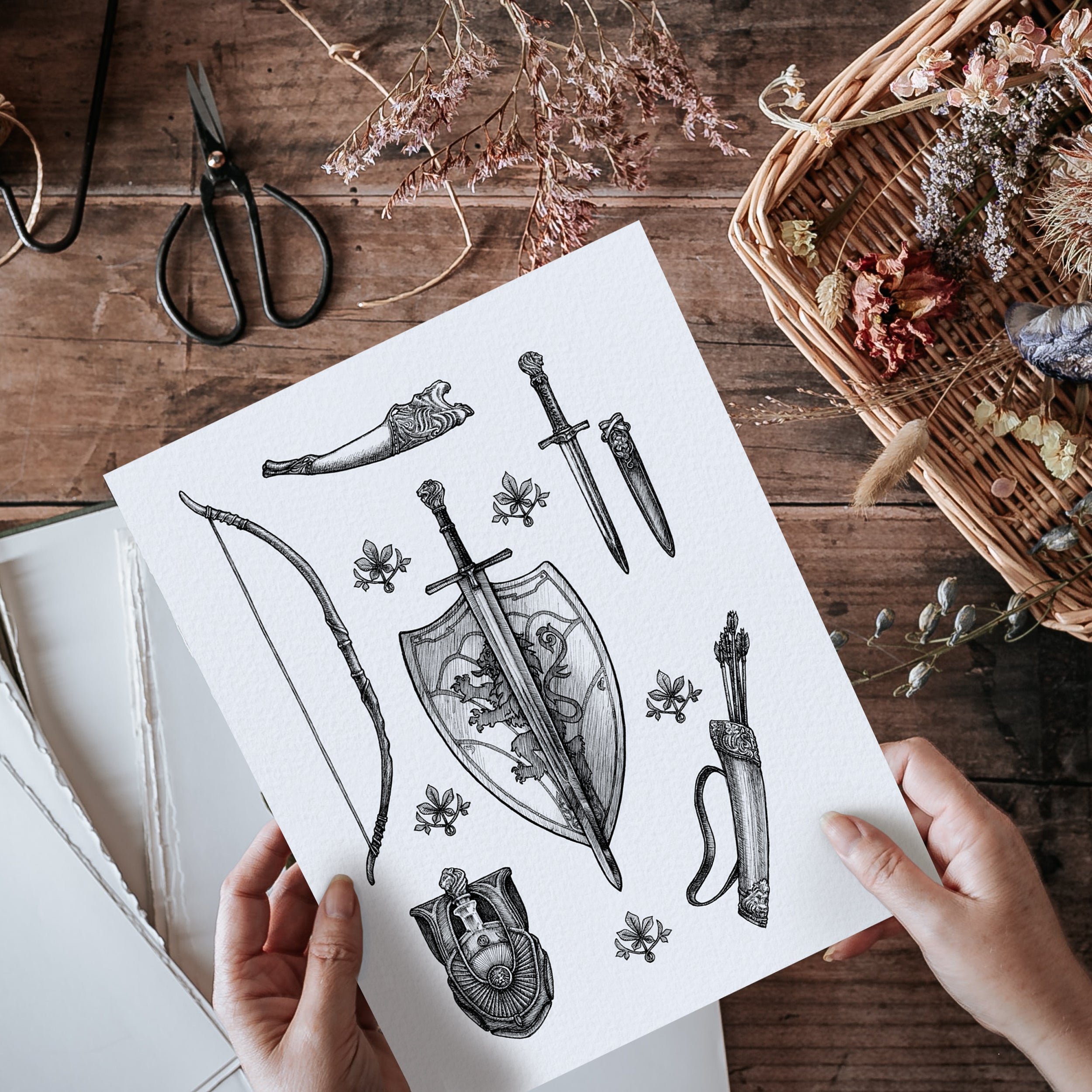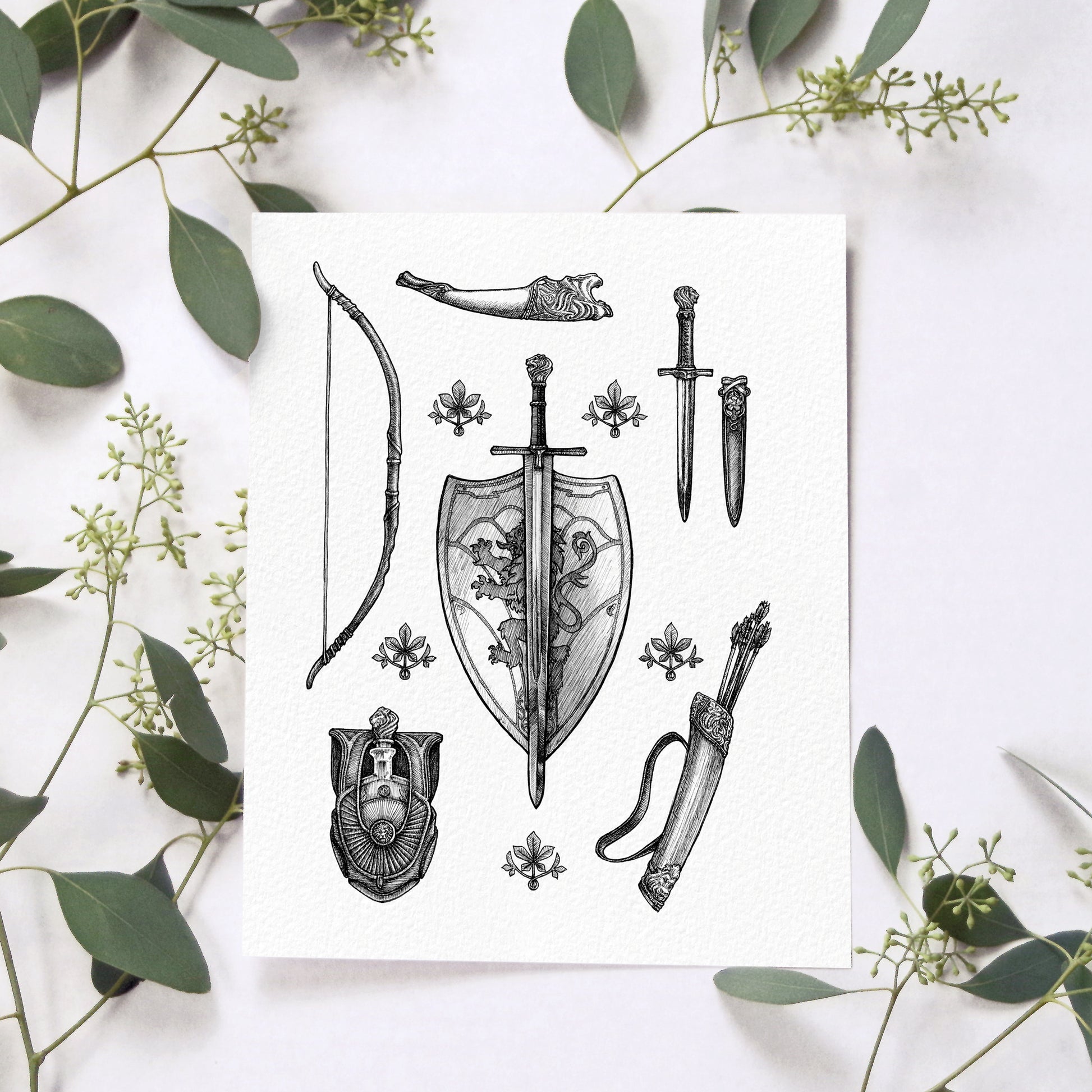 Pass through the wardrobe into the magical land of Narnia as you remember the nostalgia and adventure you loved to share with Lucy, Peter, Susan and Edmund. Inspired by the gifts given to the Pevensie children by Father Christmas, this handmade art print is the perfect complement to any medieval knights & maidens styled office, fairytale themed bedroom, or to simply add a little whimsy and magic to your life.