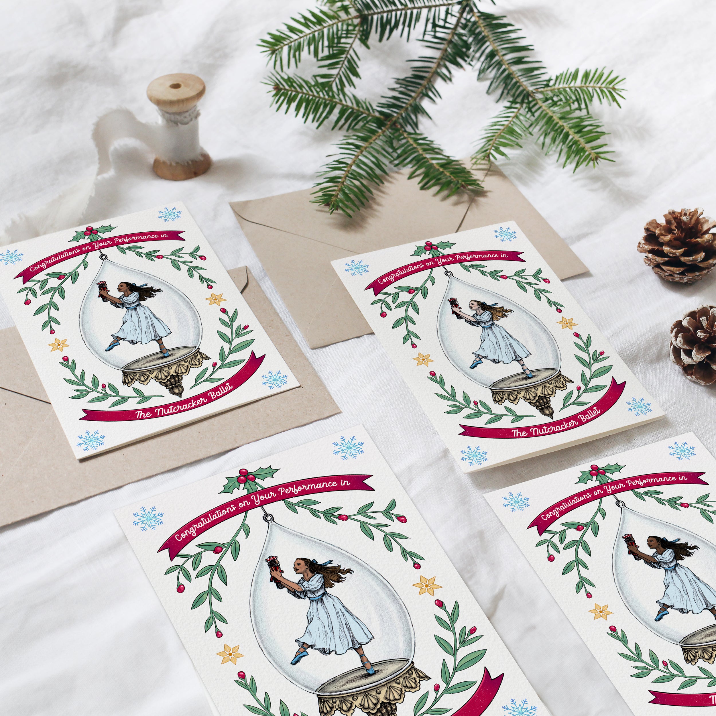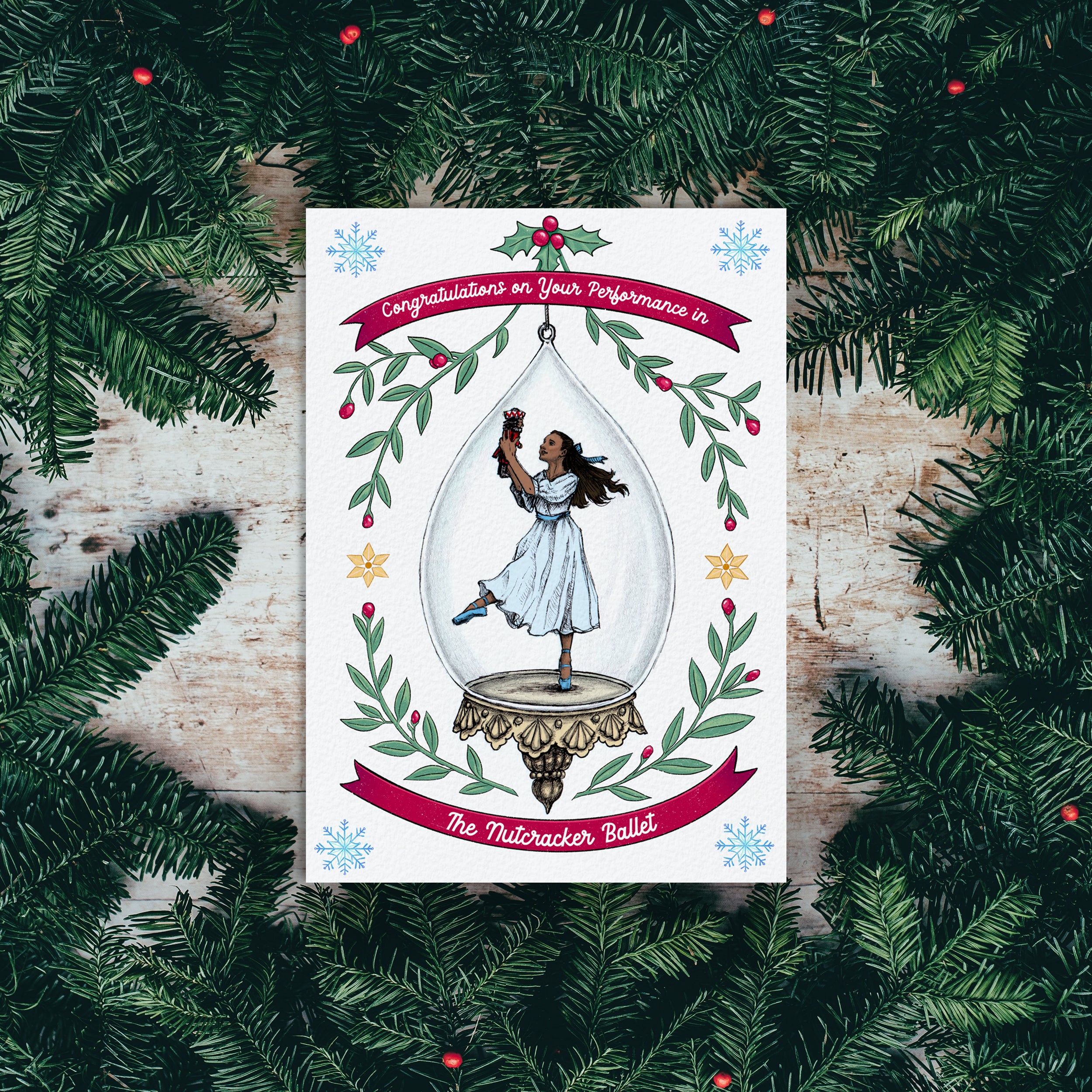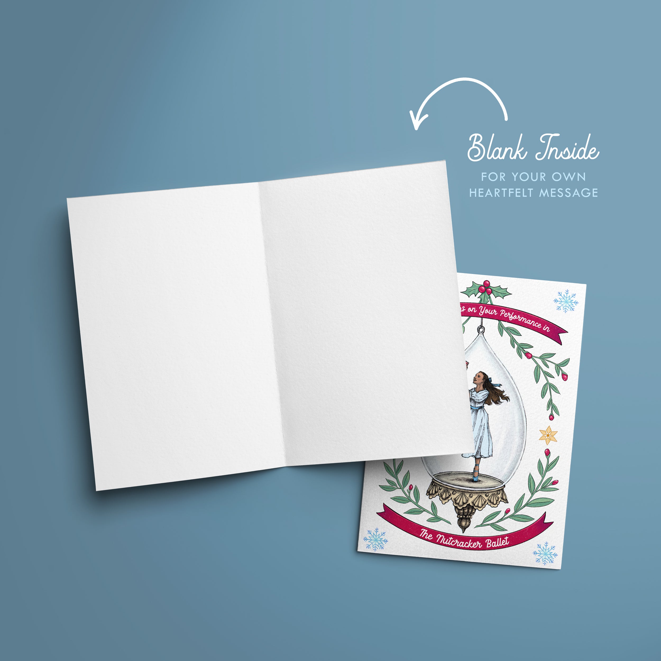 Whether they were cast as Clara or Mouse #4, help commemorate a special performance with this Nutcracker-themed handmade greeting card. Customize the wording and choose from several hair & skin tone combinations to fit your needs and help make the dancer, director, crew member, or stage parent feel extra special.