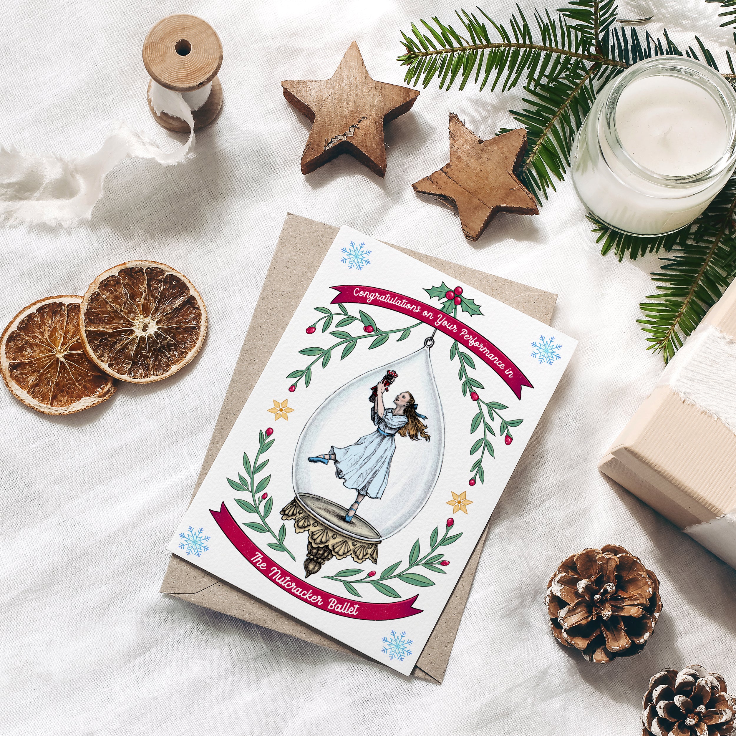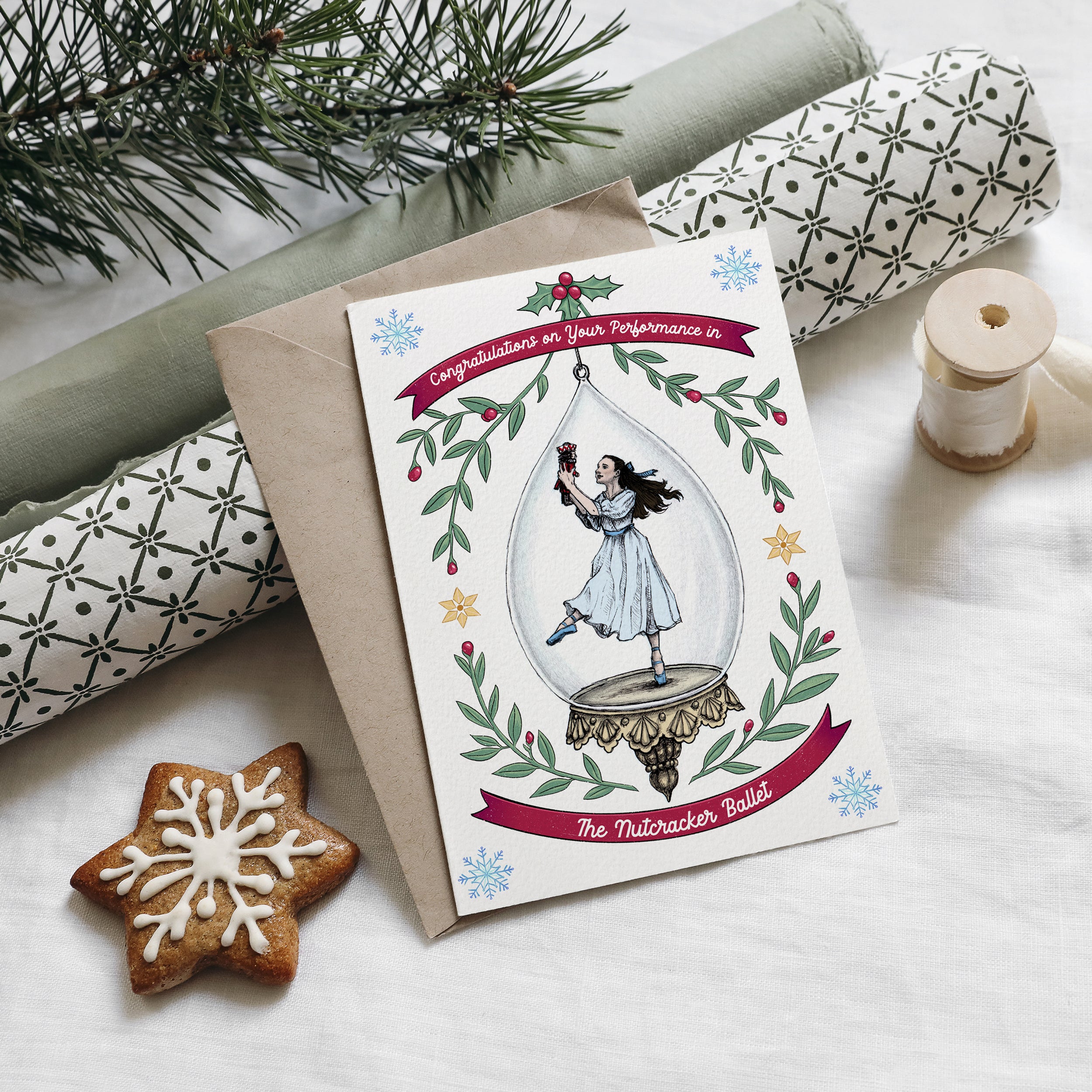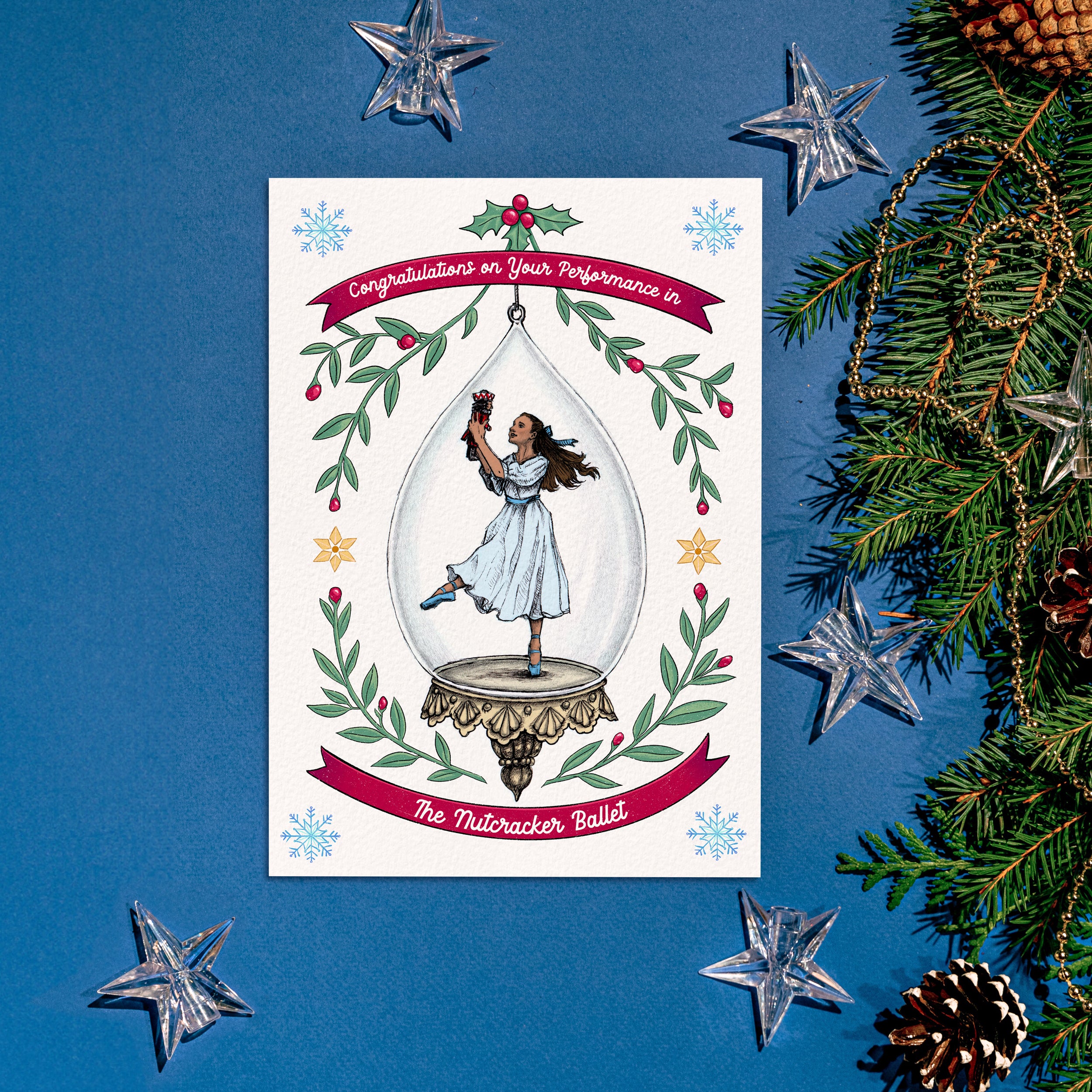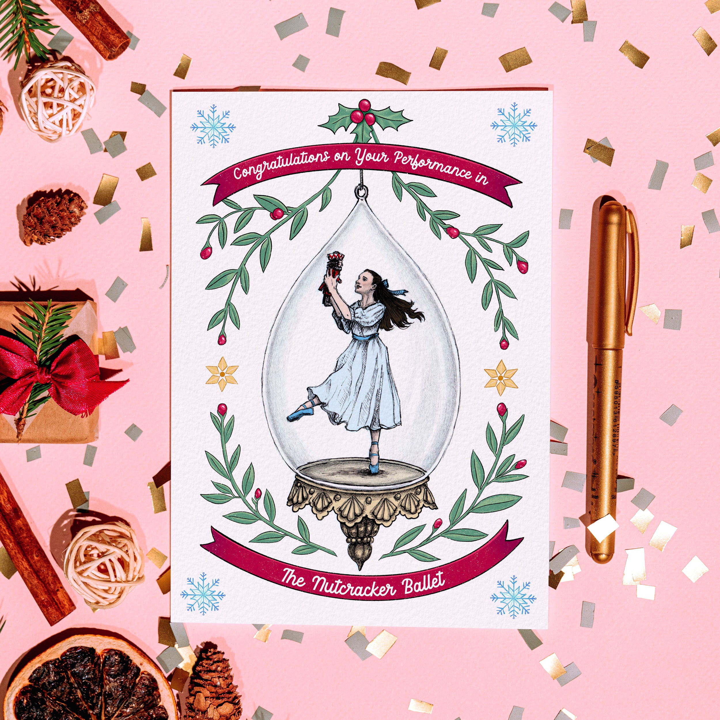Whether they were cast as Clara or Mouse #4, help commemorate a special performance with this Nutcracker-themed handmade greeting card. Customize the wording and choose from several hair & skin tone combinations to fit your needs and help make the dancer, director, crew member, or stage parent feel extra special.