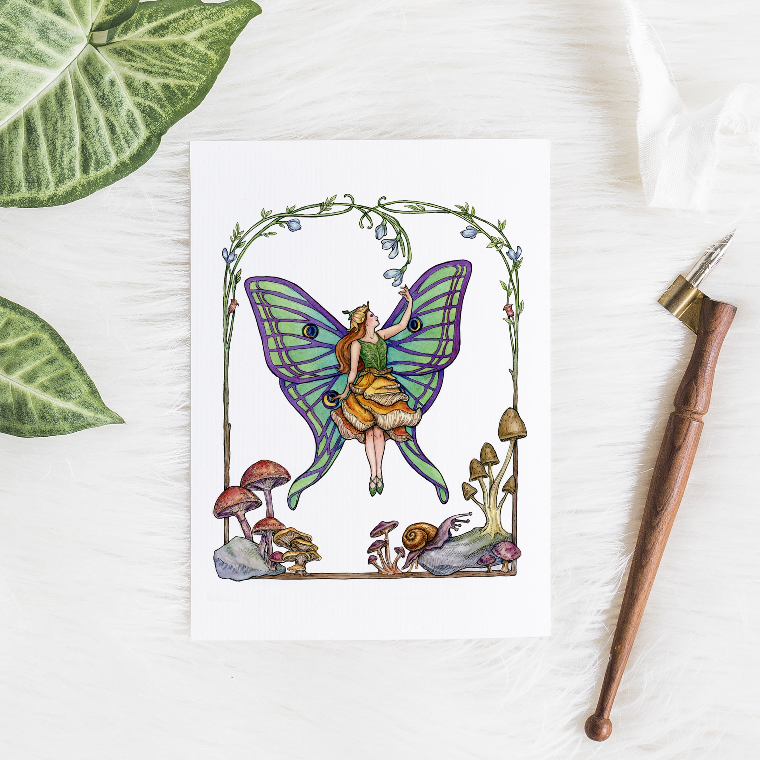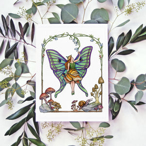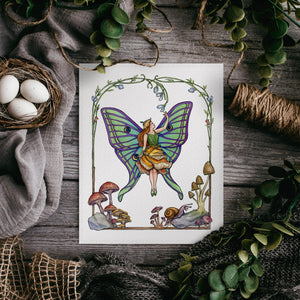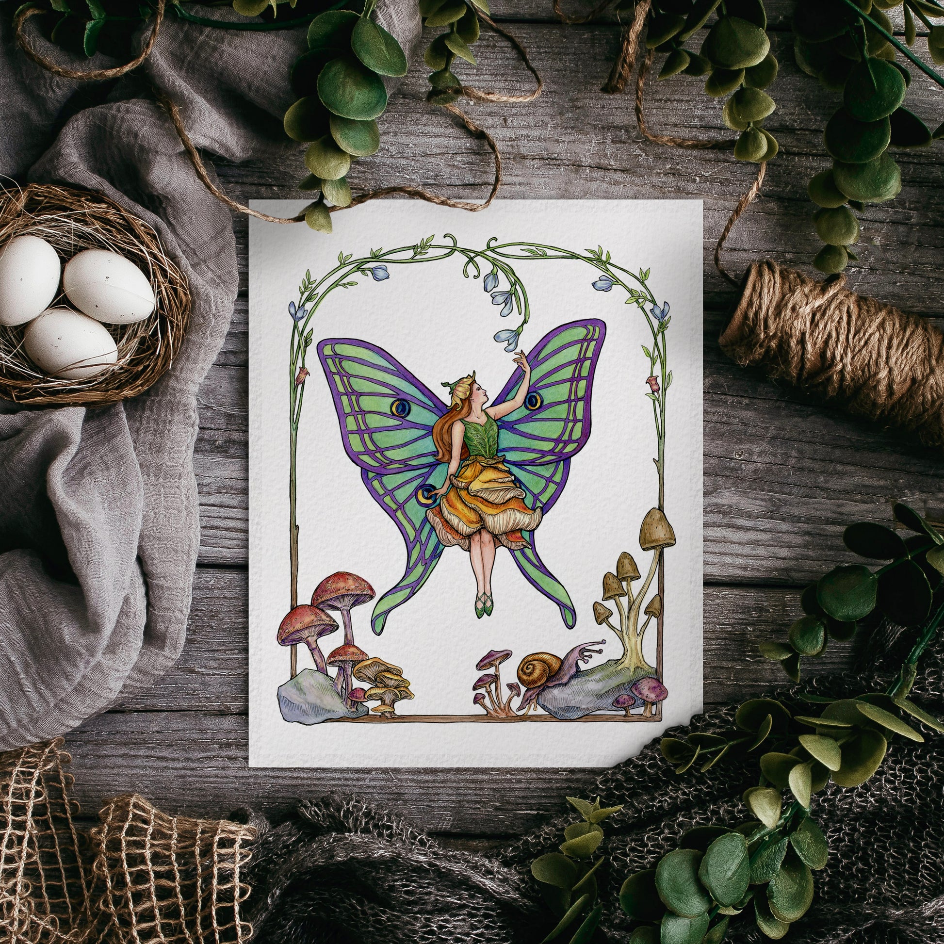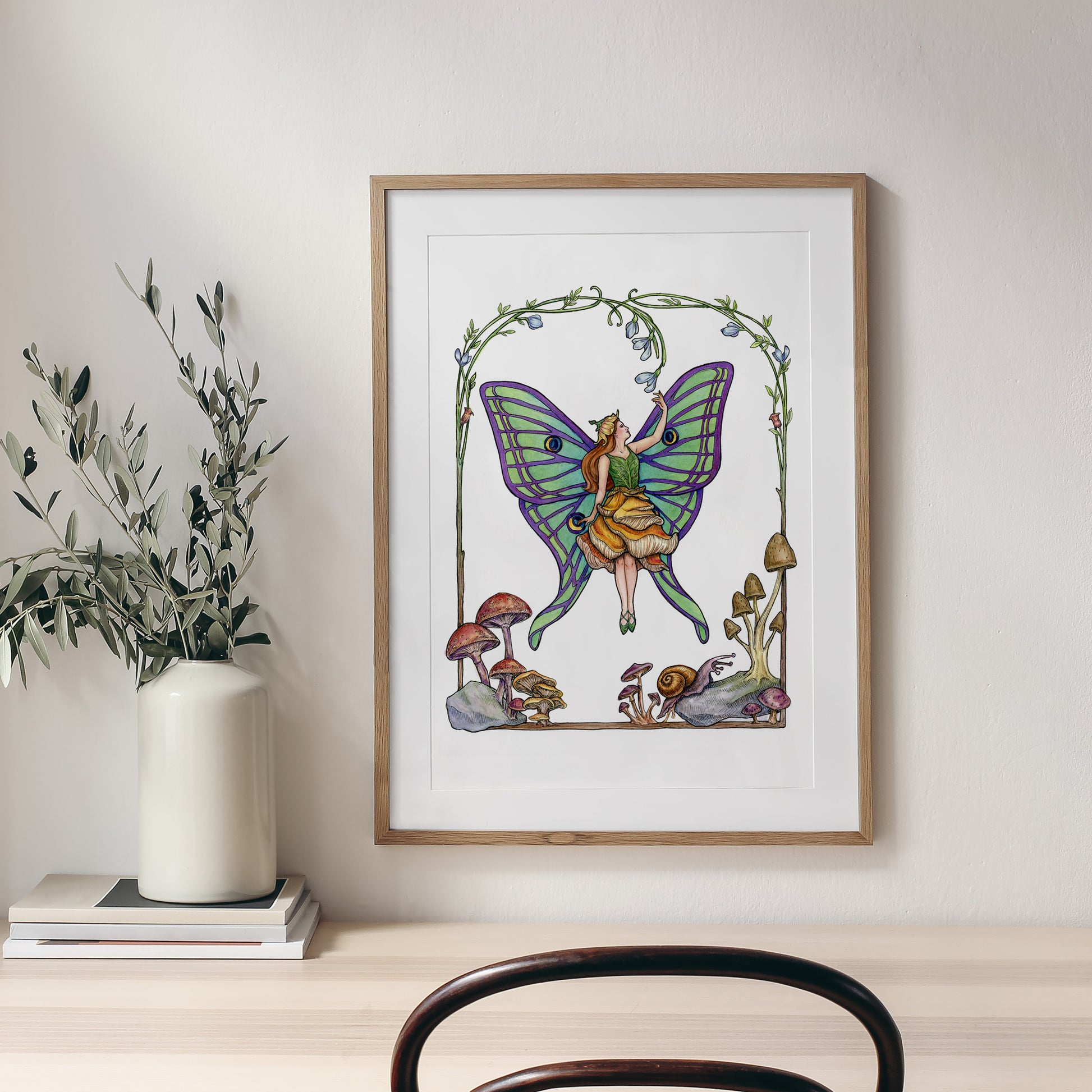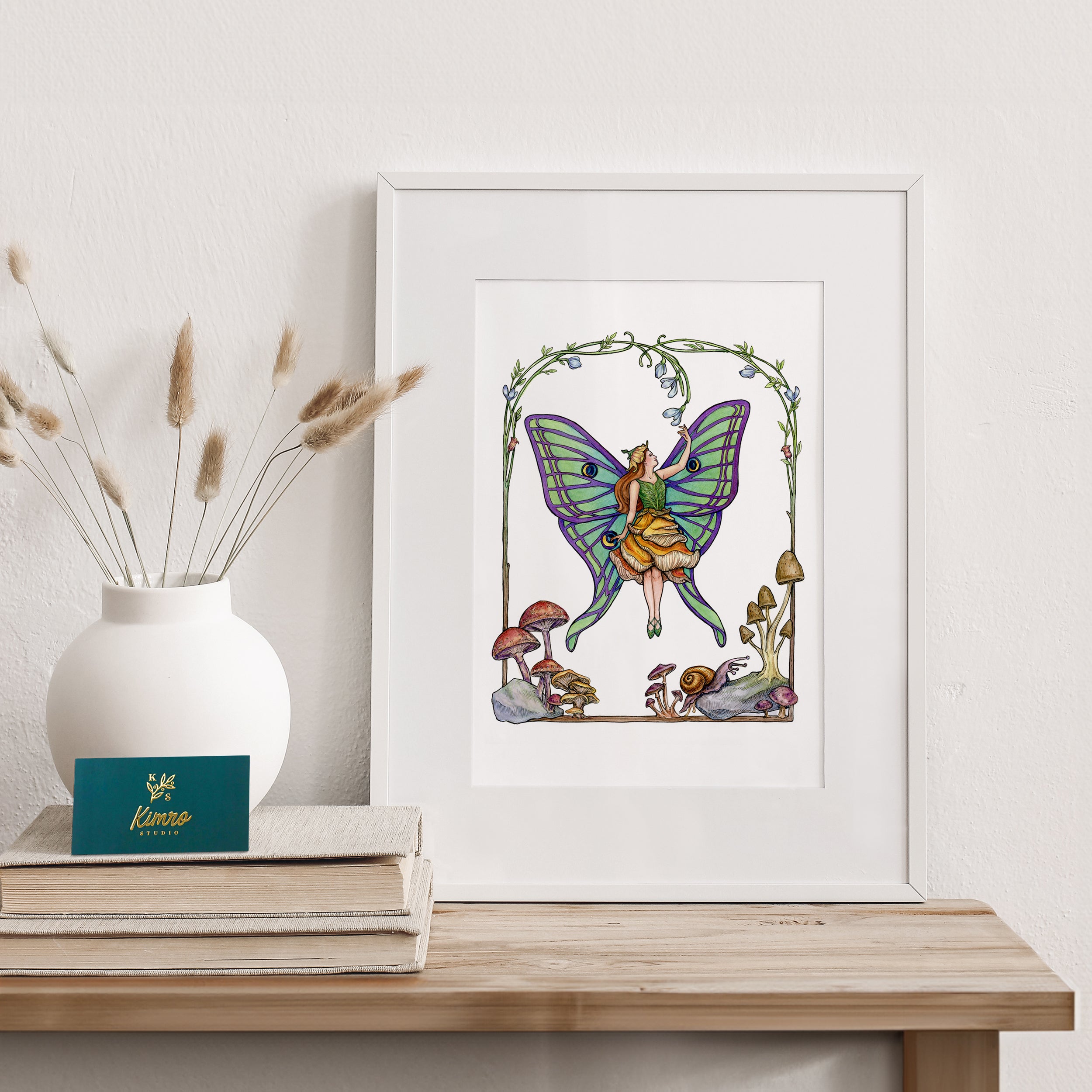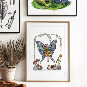 Add a touch of fairy magic to any room with this whimsical print of a mushroom fairy presiding over her woodland realm. Perfect décor for lovers of fairytales, folklore and cottagecore whimsy.