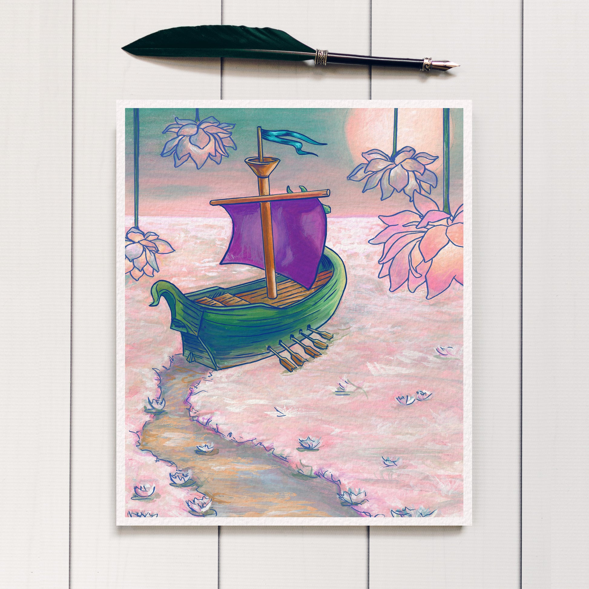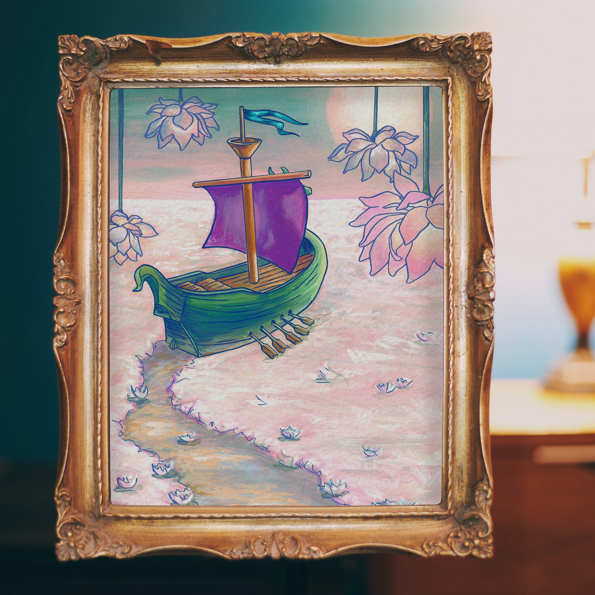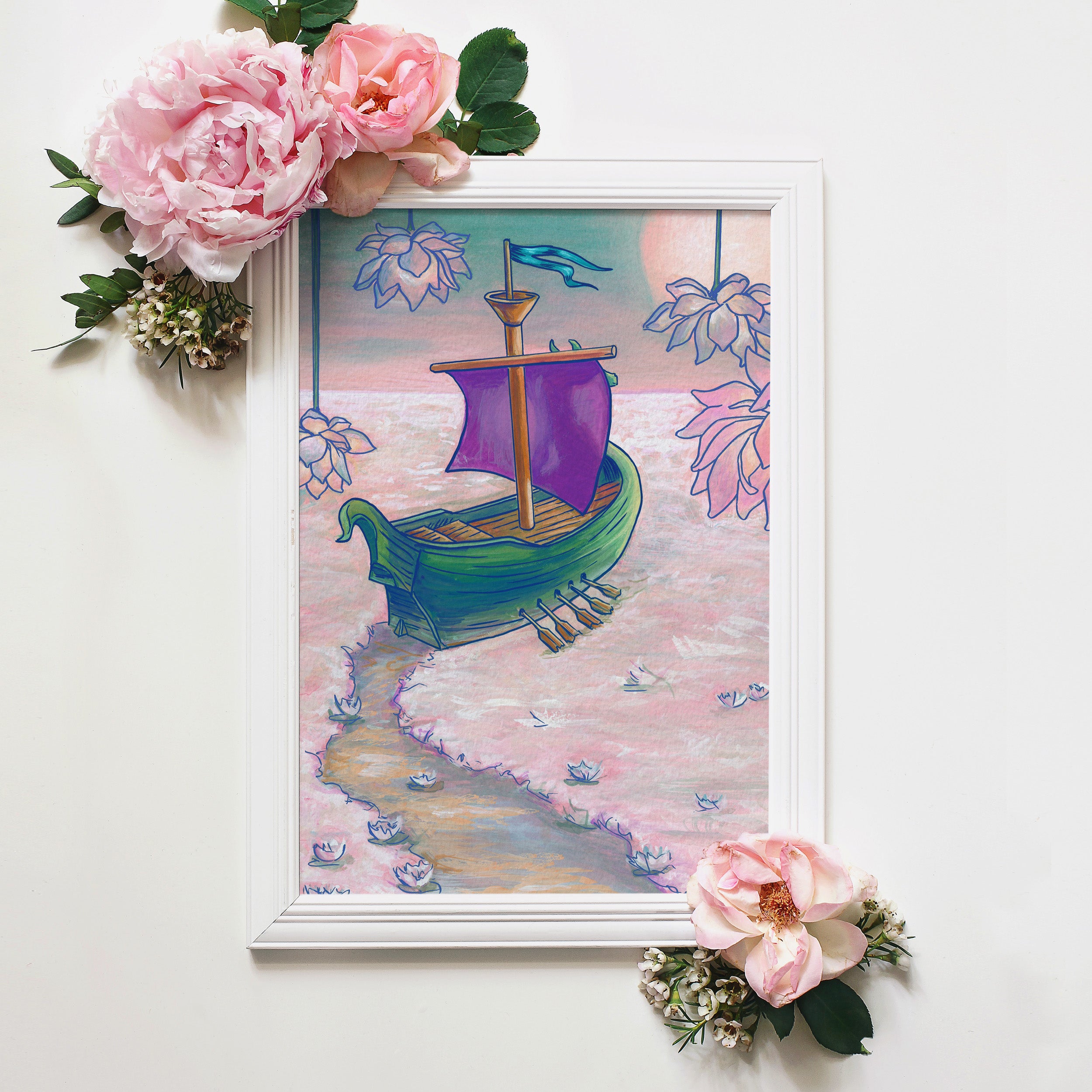 Brighten up your space with the colorful whimsy of this Narnian ship charting its way across the Last Sea covered in pink and white lotus flowers. Perfect for the fantasy book lover or Narnia enthusiast, and as décor in a kid's bedroom. I drew inspiration for this piece from C.S. Lewis’ classic novel “The Voyage of the Dawn Treader” from the Chronicles of Narnia series.