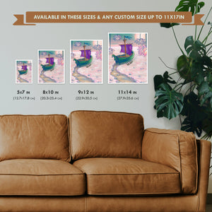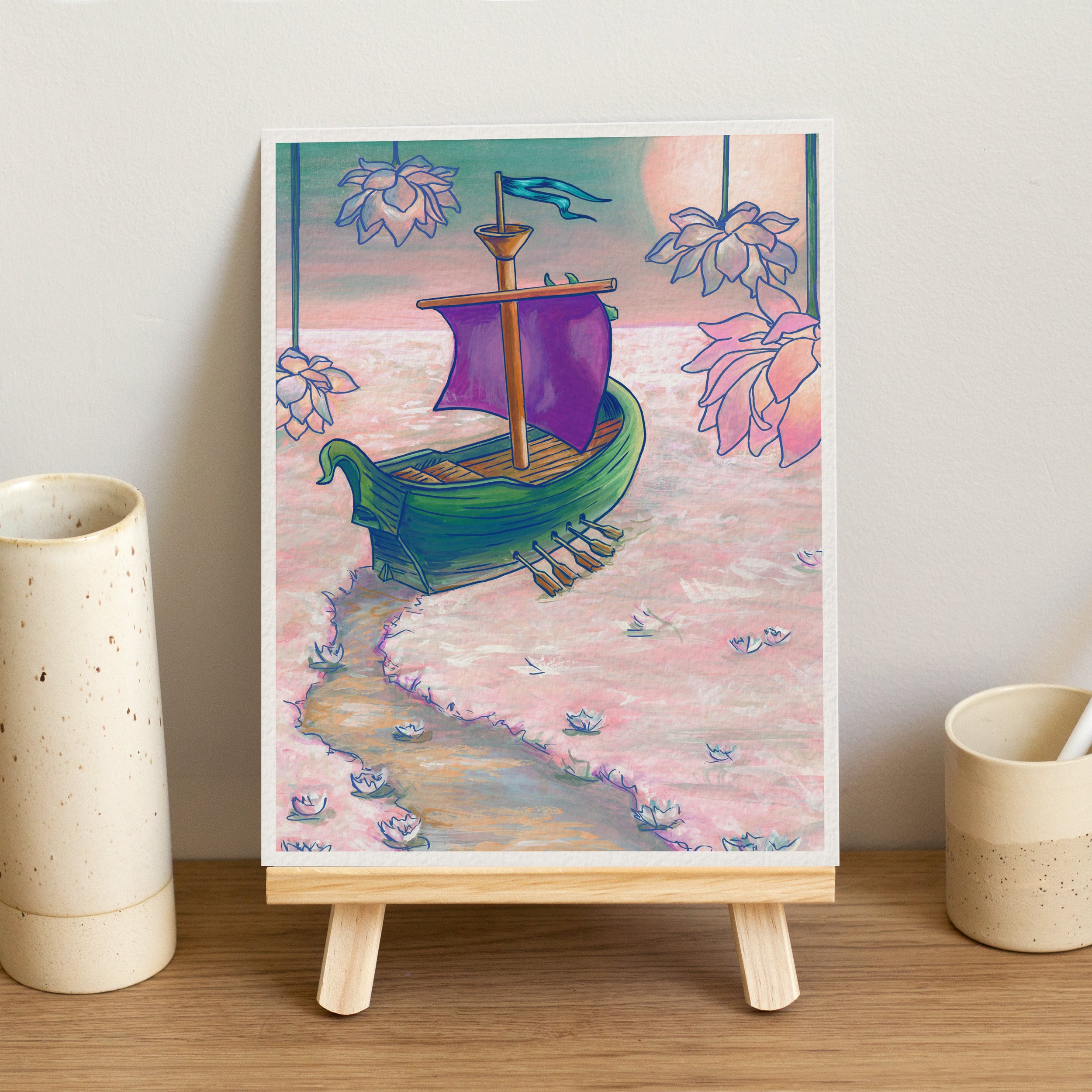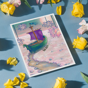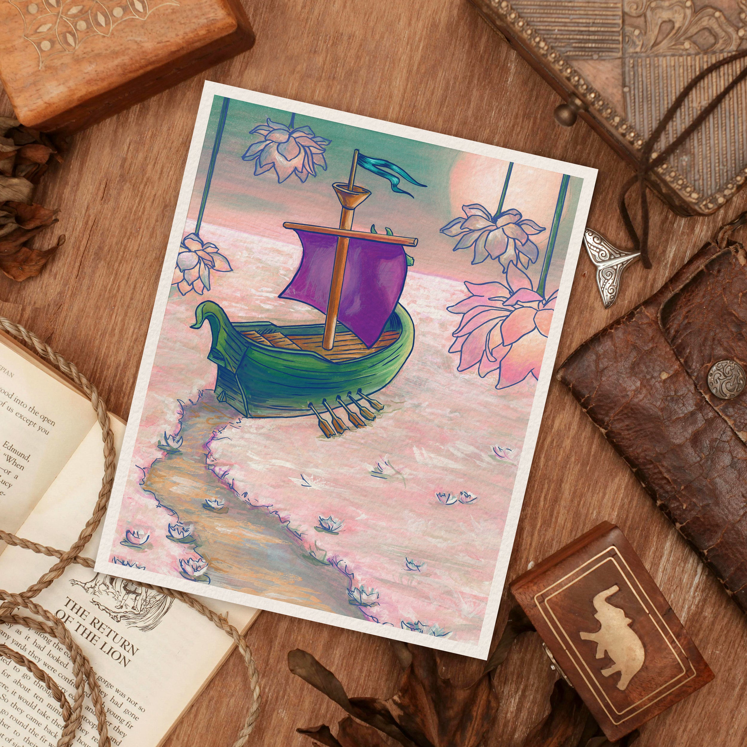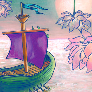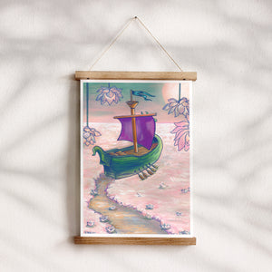Brighten up your space with the colorful whimsy of this Narnian ship charting its way across the Last Sea covered in pink and white lotus flowers. Perfect for the fantasy book lover or Narnia enthusiast, and as décor in a kid's bedroom. I drew inspiration for this piece from C.S. Lewis’ classic novel “The Voyage of the Dawn Treader” from the Chronicles of Narnia series.