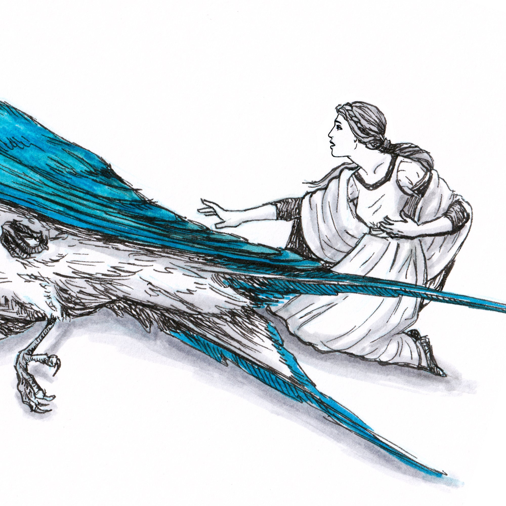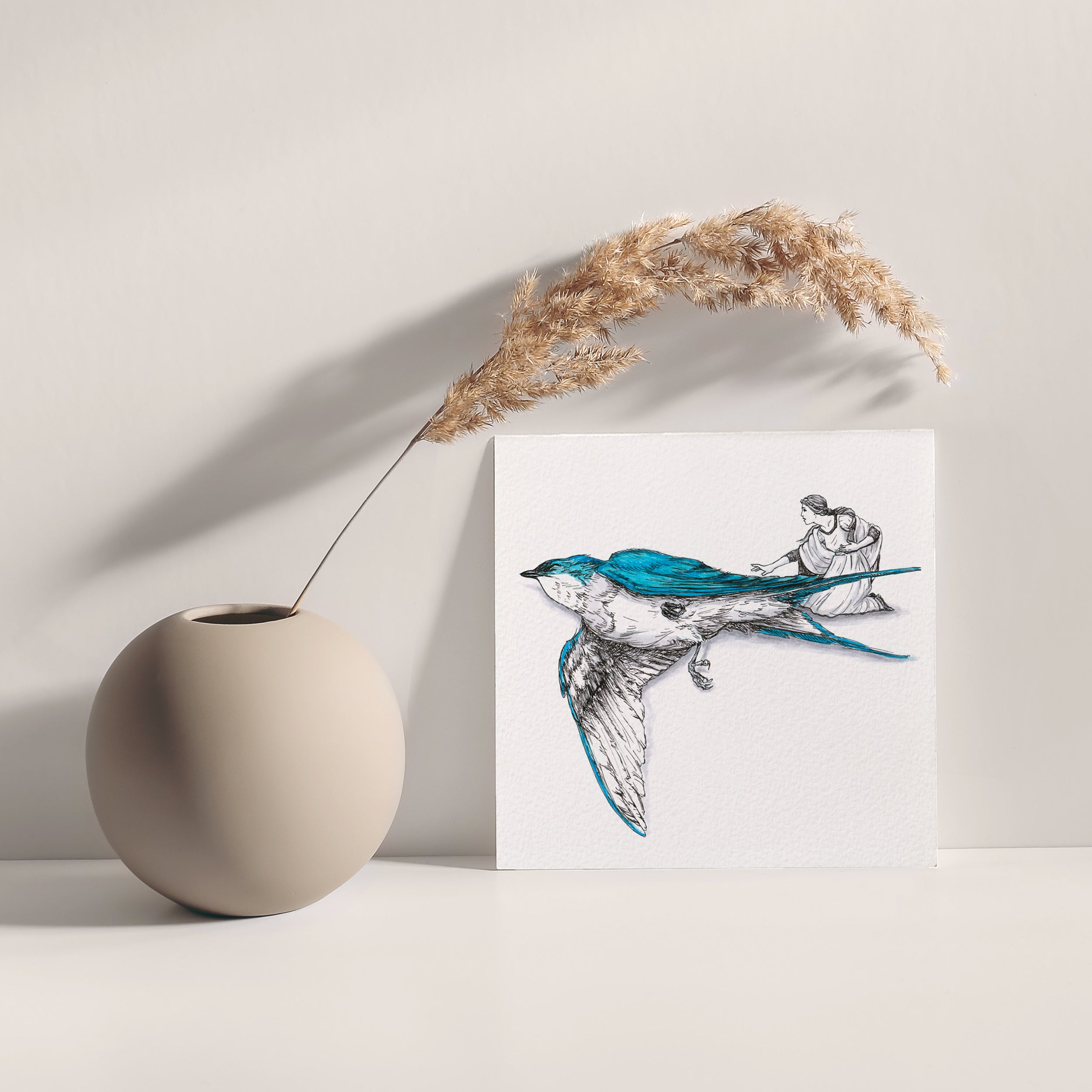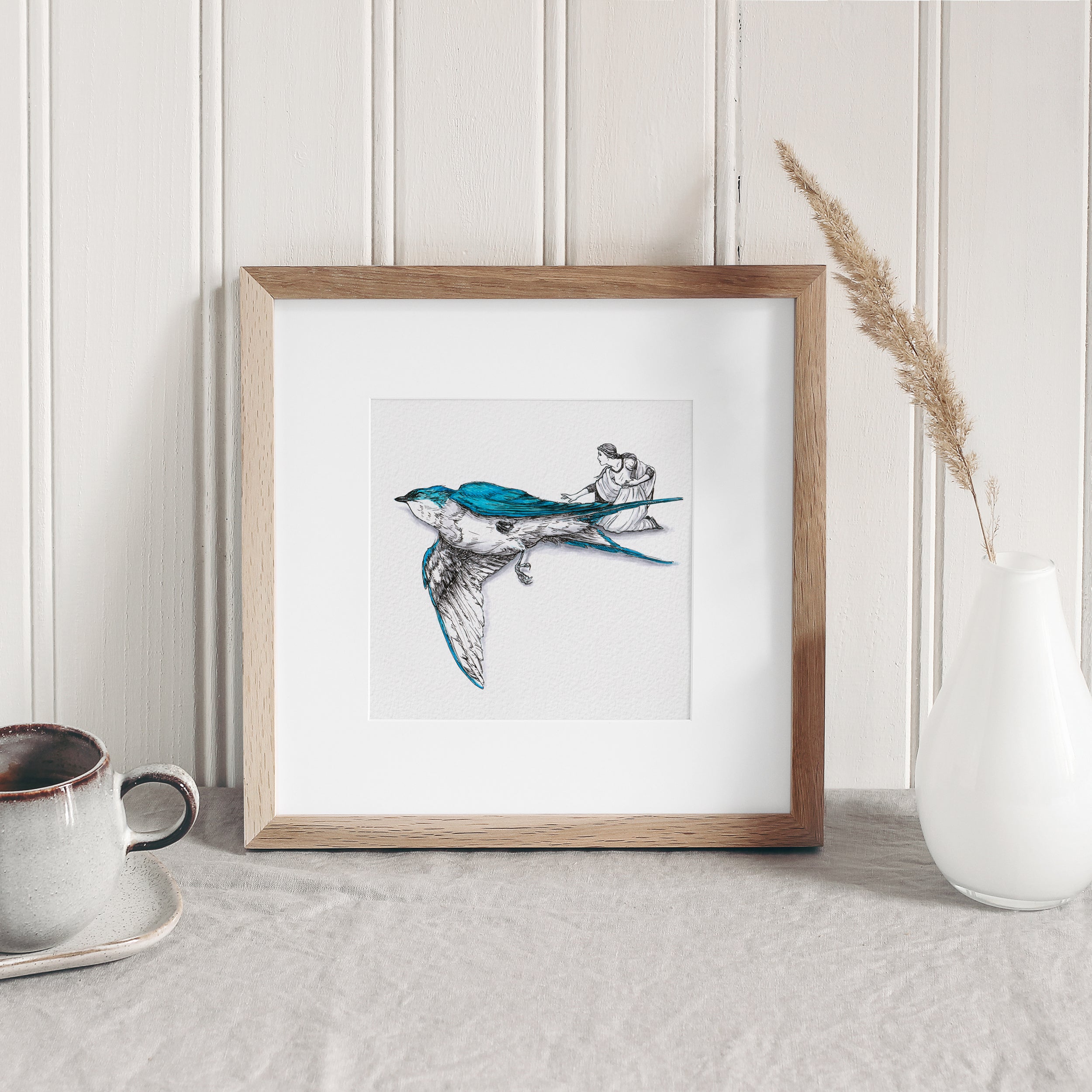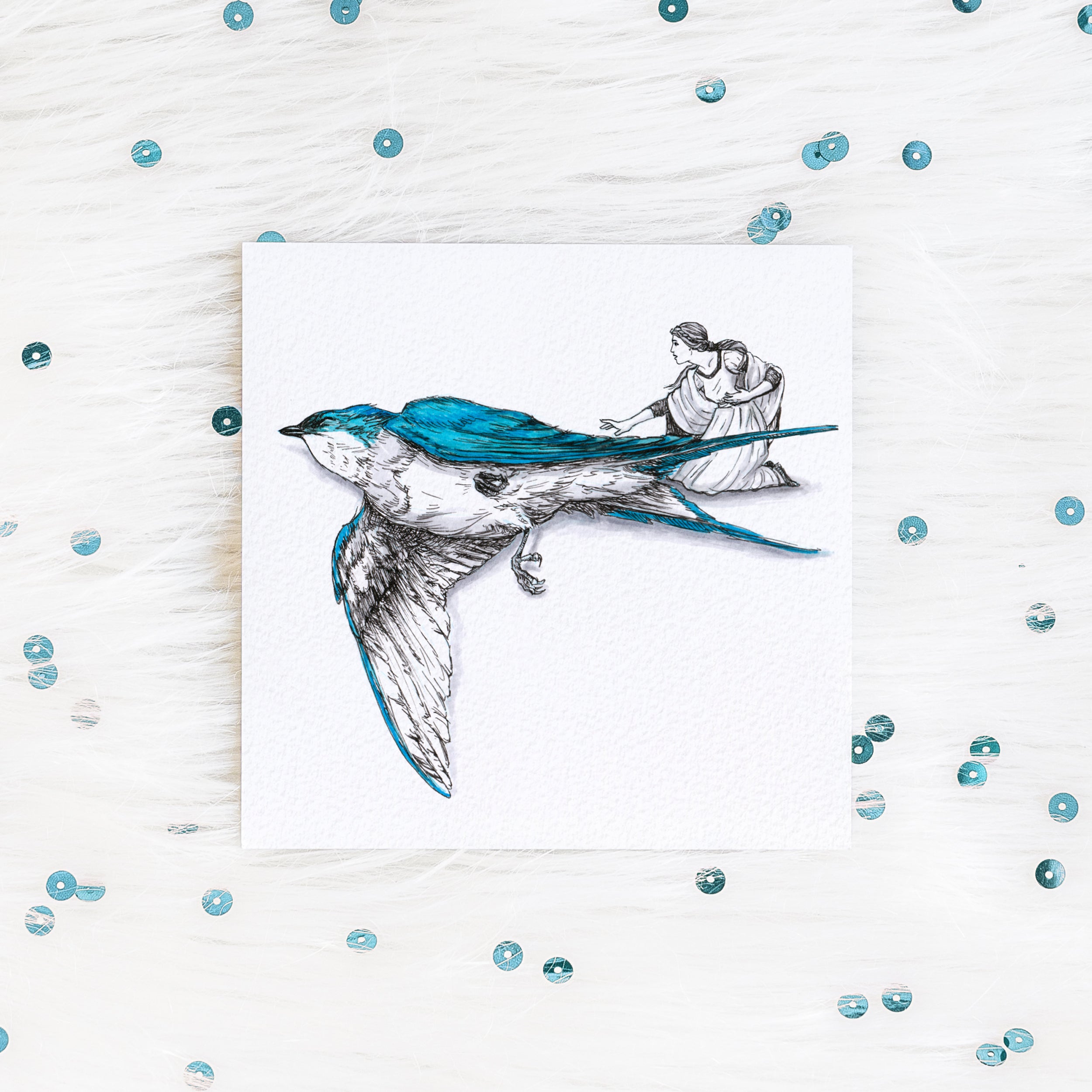 This piece was part of a series I did on classic stories, and was inspired by Hans Christian Andersen's story, “Thumbelina." The original artwork was made with ink on watercolor paper.