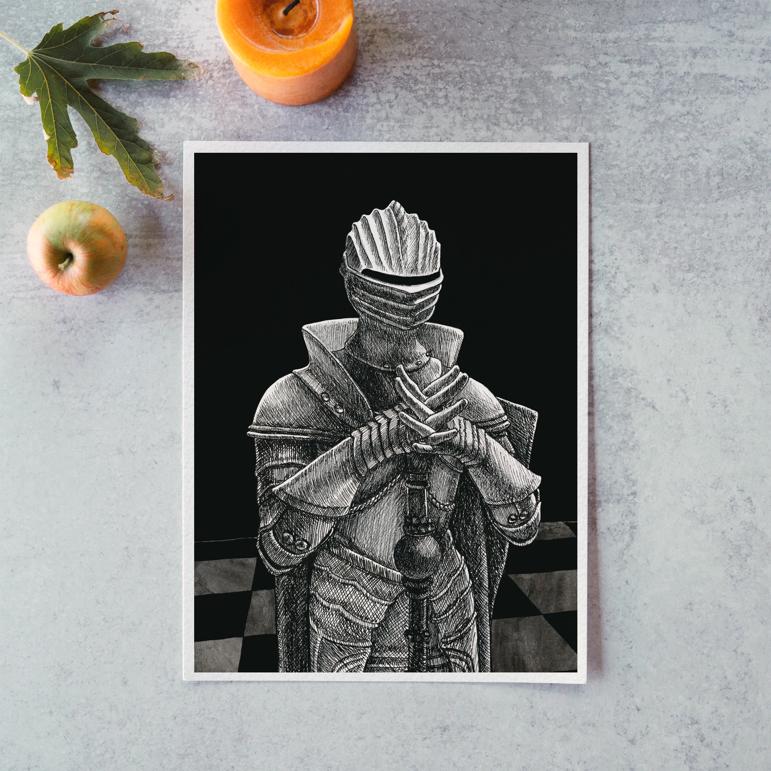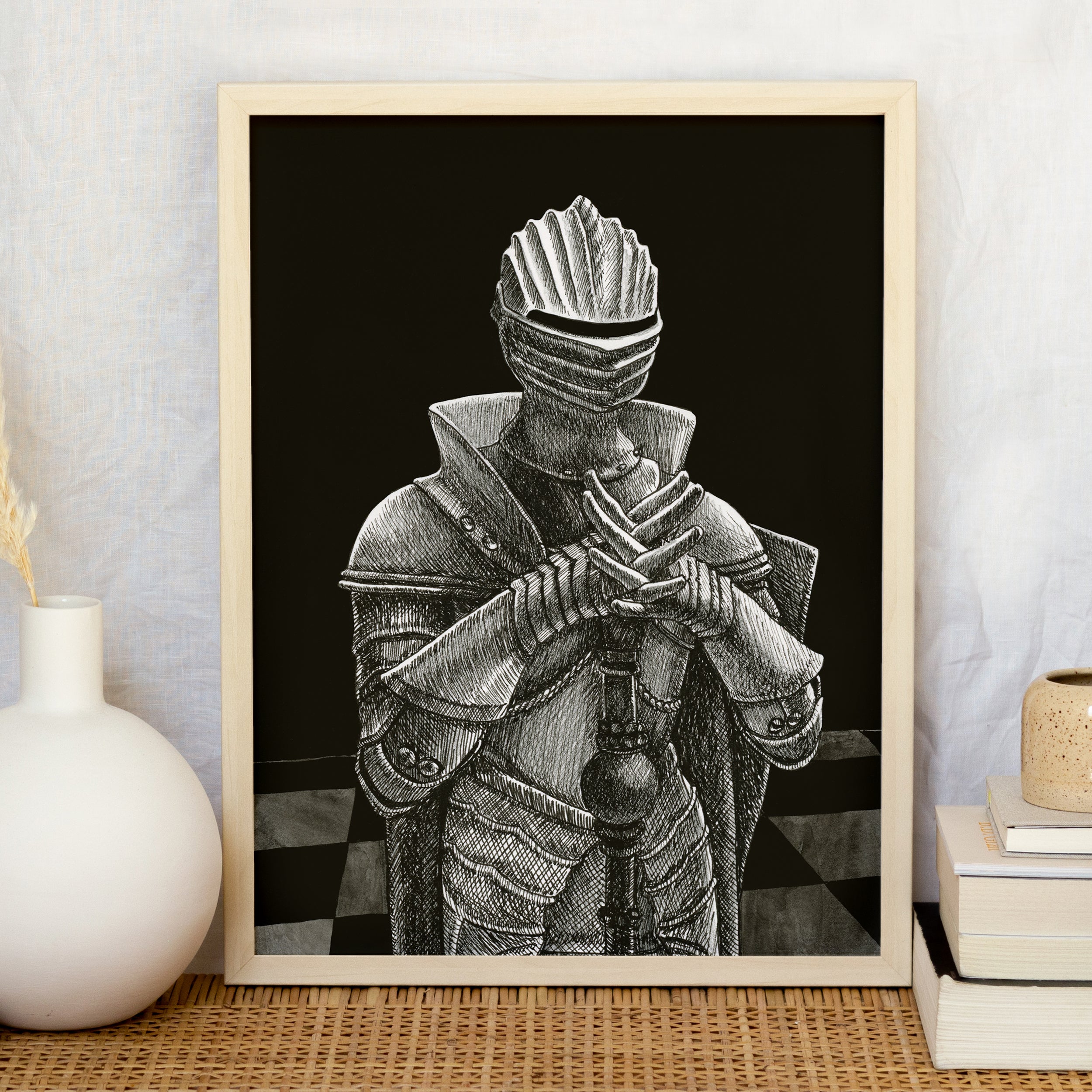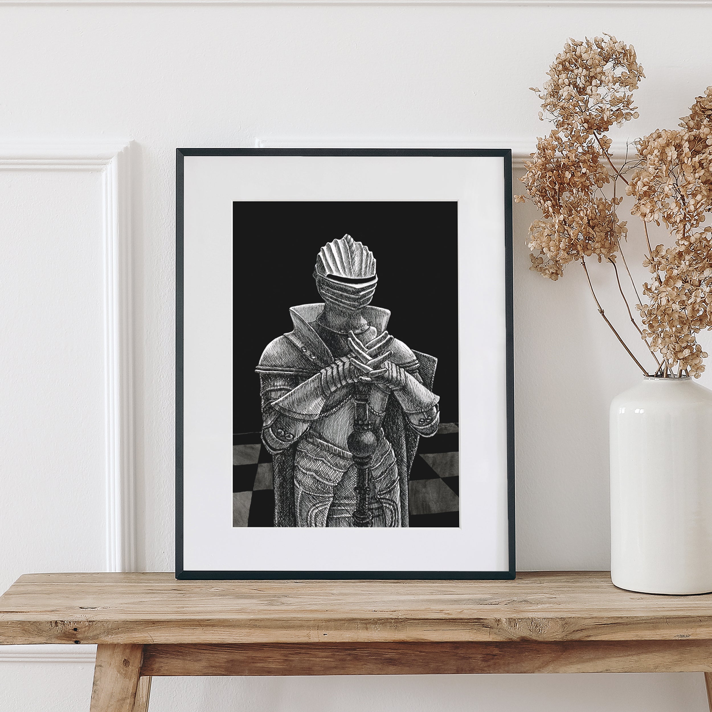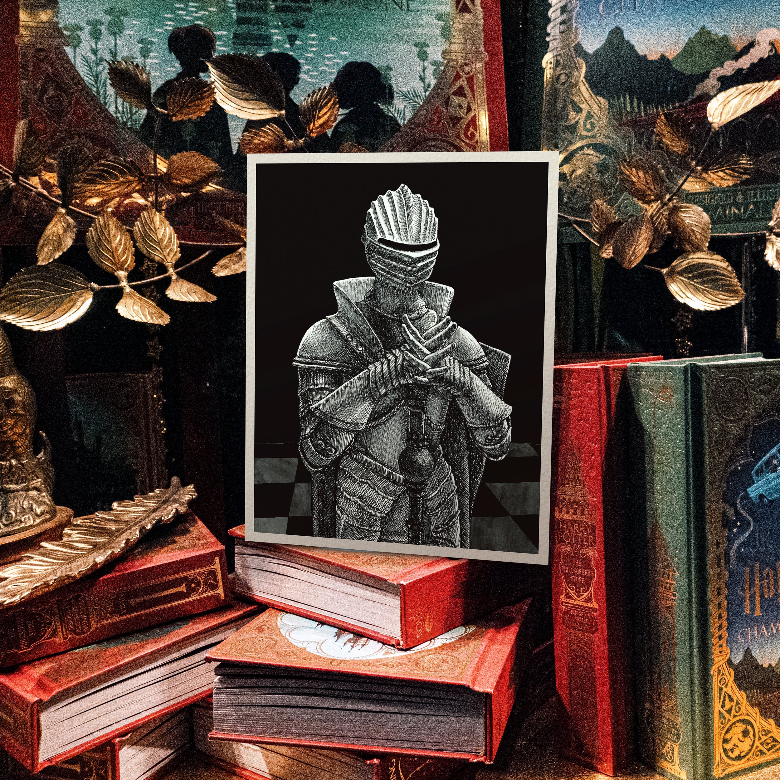 Be transported to your favorite Magical World with this moody ink illustration of The Queen battling Harry, Ron & Hermione in a particularly dangerous game of Wizard’s Chess! Perfect as dark academia office décor, in a favorite reading nook, or as a unique gift for the fantasy-loving knightcore enthusiast.